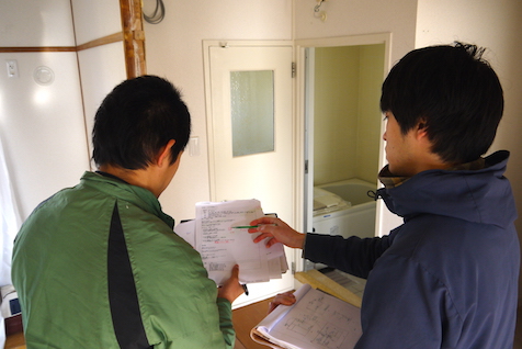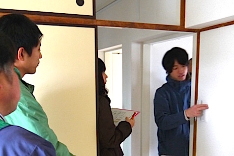DIY住宅を見つけて申し込みをしたら、物件の内覧です。ザックリとDIYのプランを描いておいて、質問したり手当たり次第にメジャーで測ったりしちゃいましょう。写真はDIY(フル)のトーリーの内覧の様子です。