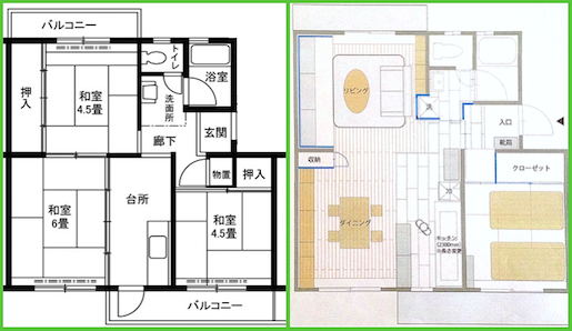 和室2つをつなげて、ひとつのリビング・ダイニングにしてしまおうということです。仕切りが取り払われ、大きな一室になっているのがわかりますね。開放感!