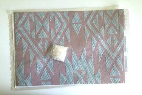 この壁紙は、水に溶いたノリで貼り付けるタイプのようです。しかし、この柄のなんと挑戦的なこと。