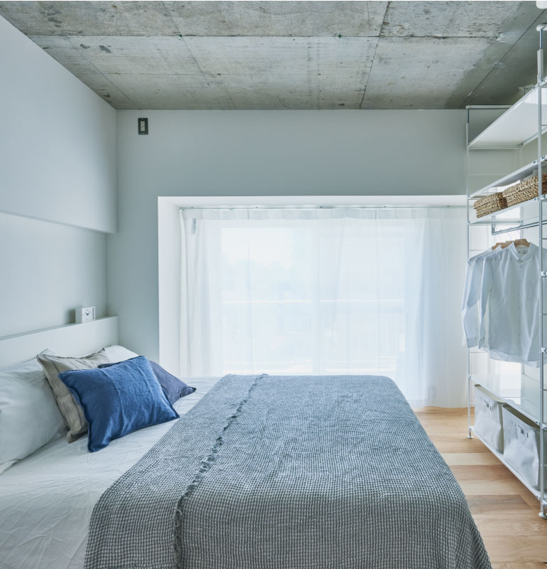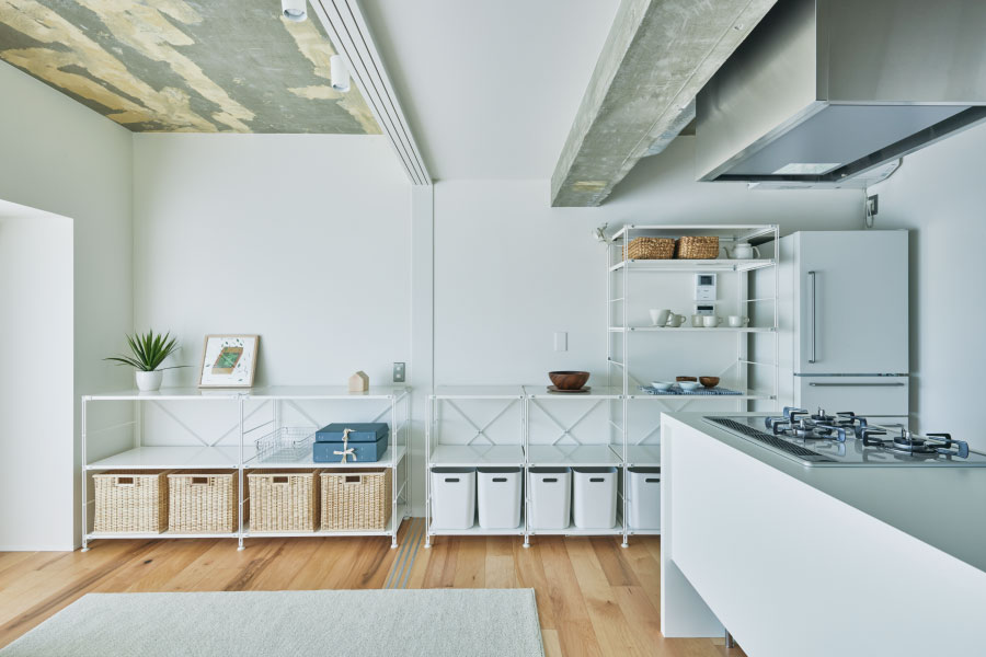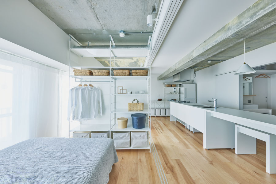 無印良品のスチールユニットシェルフを間仕切り家具として活用。シェルフを外して、空間を広く使うこともできます。