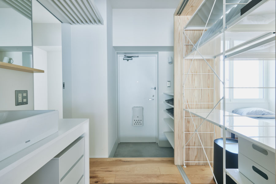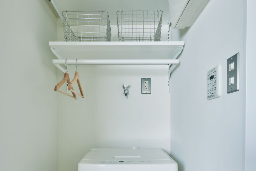 さらに、洗面台の上部にハンガー掛けスペースと収納棚を設置することで、限りある空間を有効活用しています。