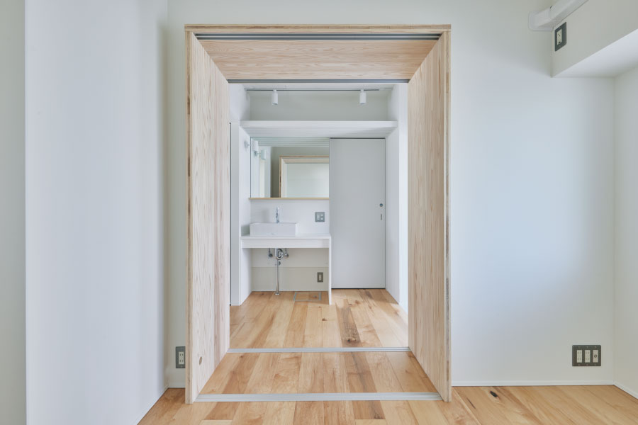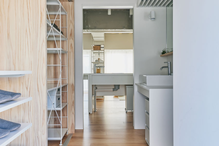 一般的には移動機能だけを担う廊下に洗面台を設置。機能性が足されて、無駄なスペースを減らしました。