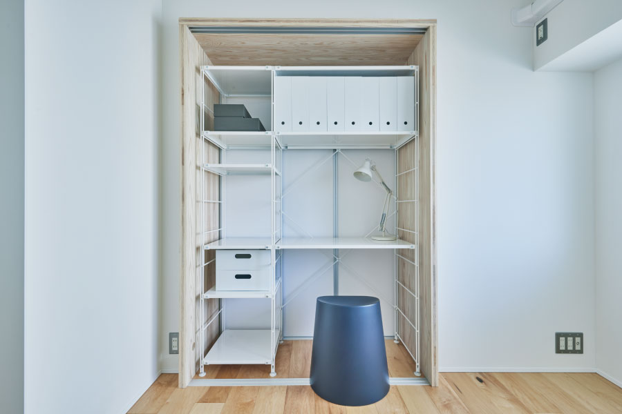 壁面に「木囲い」を挿入。デスクワークや収納として活用できるだけでなく、部屋同士をつなげたり、区切ったりすることができます。