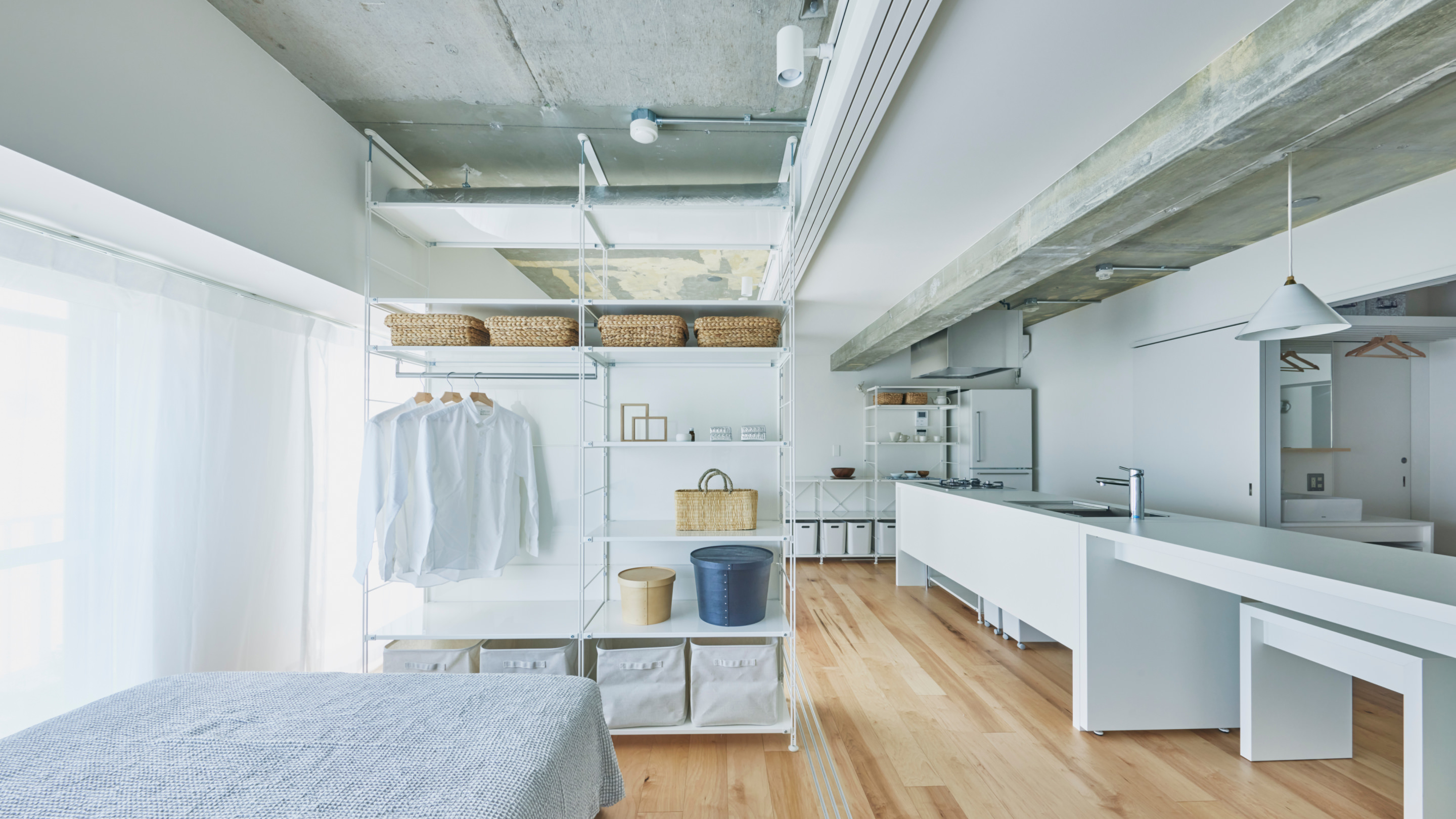 お好きなシェルフを設置し、インテリアとして見せる収納を楽しむとともに、自由に収納家具を動かすことで将来の空間の使い方に制限を設けず可変性を保ちます。