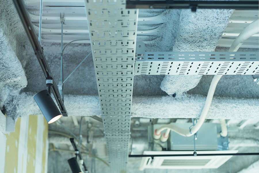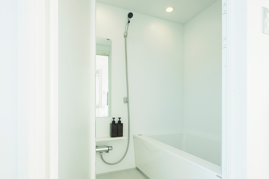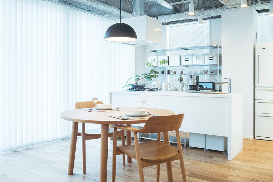 大きな開口部のある明るく心地よい空間です。内部は構造あらわしの天井、コンクリートの壁、標準仕様の塗装壁、ラフなフローリングの床材で構成されています。全体としてリノベーションらしいラフな質感を感じることができます。キッチンは標準品の組合せキッチン。洗面台やユニットバスもあり、標準品の設備やインナーサッシが展示されています。また、無印良品の家具や小物で構成された暮らしが表現されています。ぜひご体験ください。