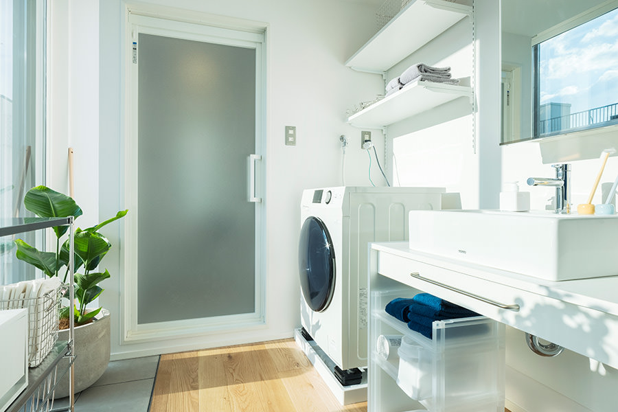 洗面脱衣室。標準仕様の洗面や無印良品の家具や小物で収納をコーディネートしています。