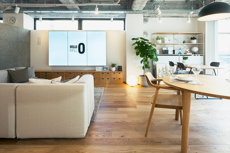 モデルルーム入口。MUJI INFILL0のコンセプトムービーが流れています。