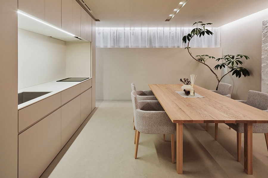 キッチンや洗面も一体の仕上げとすることで、生活感を隠し空間をすっきりと整えます。