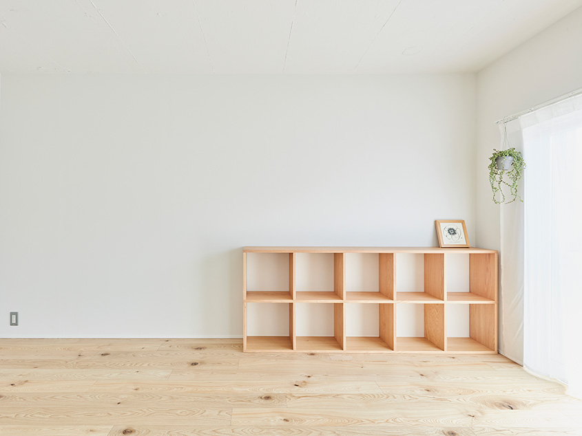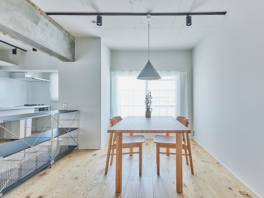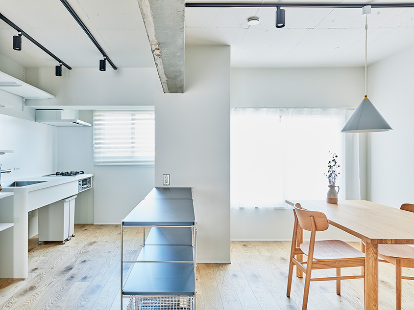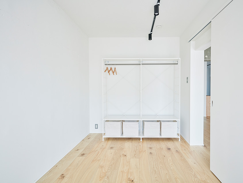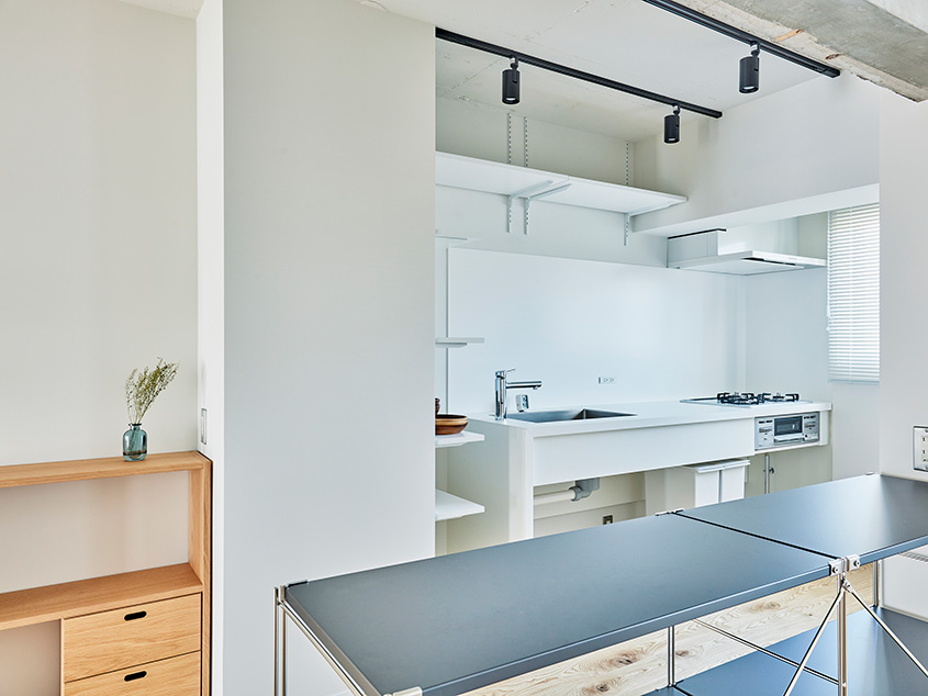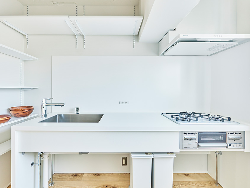 キッチンはリビングダイニングから少し奥まったところにありますが、仕切りを設けていないので家族の気配を感じながら家事を行うことができます。MUJI×UR団地リノベーションプロジェクトで開発した、「組合せキッチン」を採用しています。作り付けの収納を設けていないキッチンなので、使う方に合わせて自由にカスタマイズすることができます。