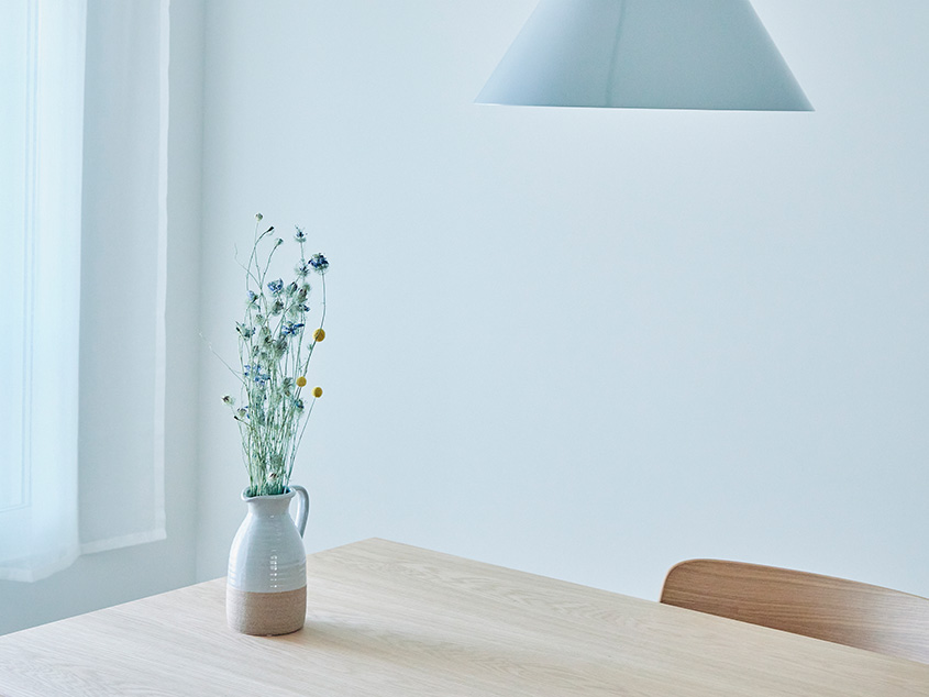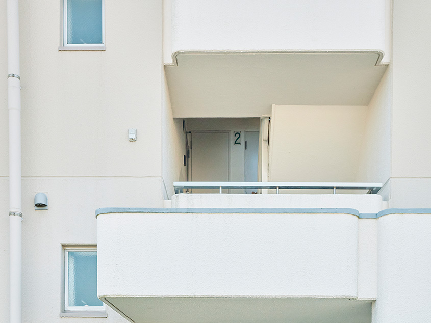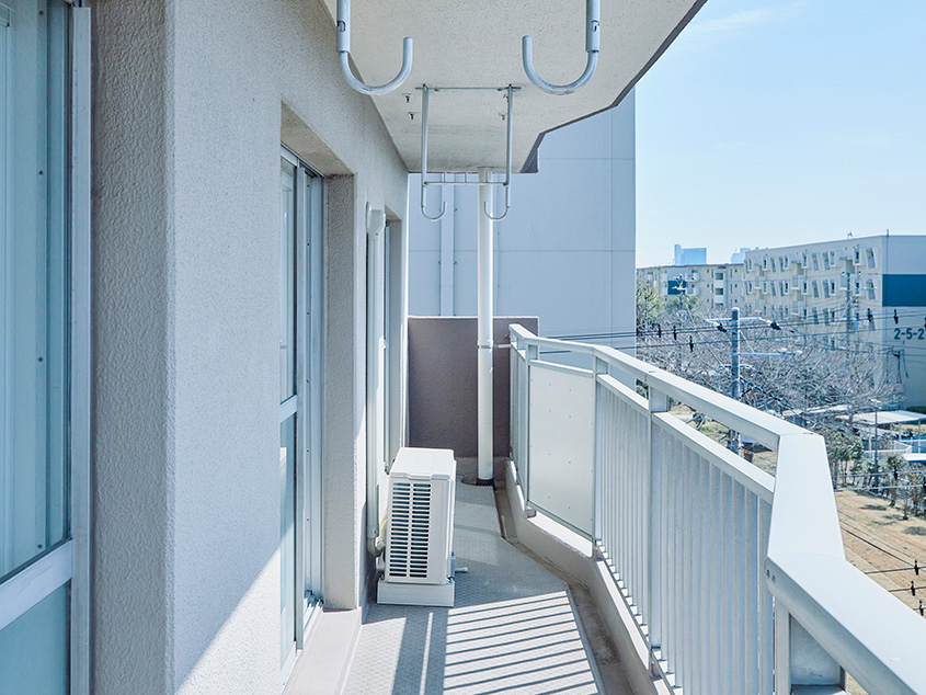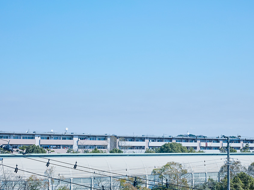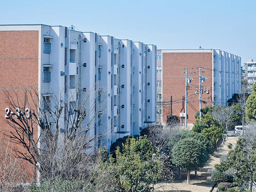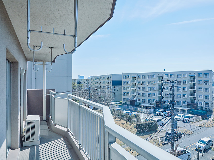 今回リノベーションを行ったのは、千葉県習志野市にある「秋津第二団地」。5階建の4階のお部屋です。エレベーターはありませんが、団地ならではの日当たり、風通しのよさを感じることができます。敷地内は管理が行き届いており、きれいに剪定されている木や草花も多いため四季の変化を楽しむこともできそうです。