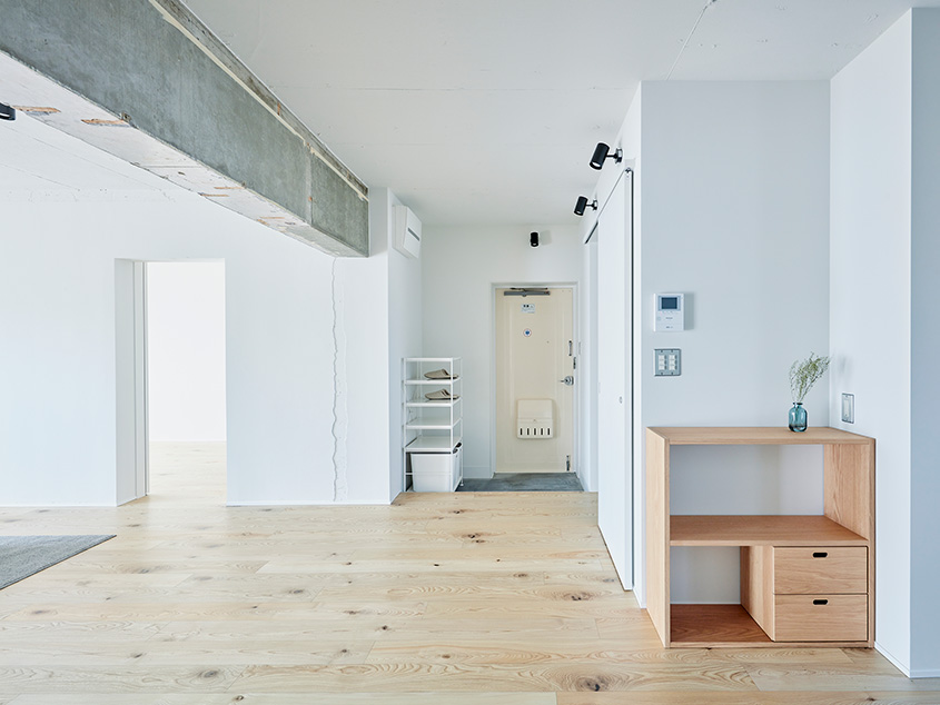 玄関はもともとあった壁を取り払うことで、暗く籠った印象がなくなりました。玄関のすぐ近くに洗面室を設けているので、入口の引戸を開けておけば帰宅してすぐに手を洗ったりお風呂に入ったりすることができそうです。