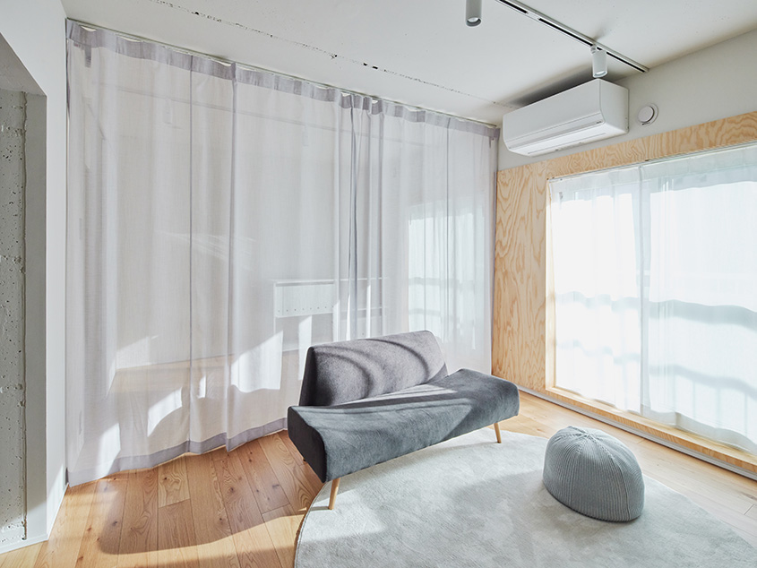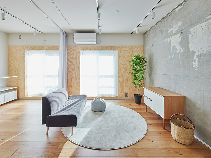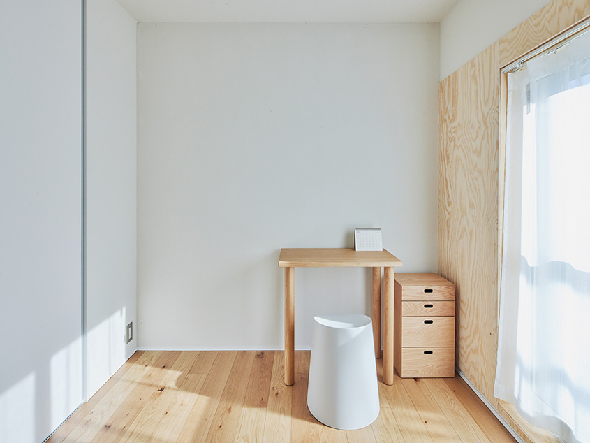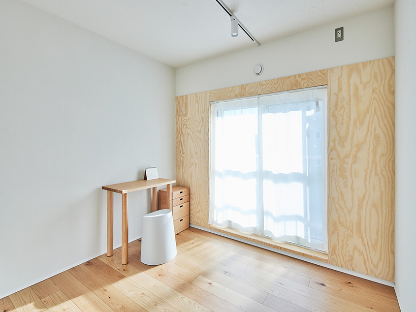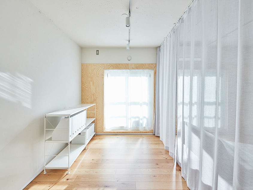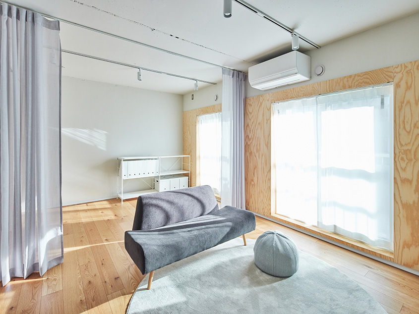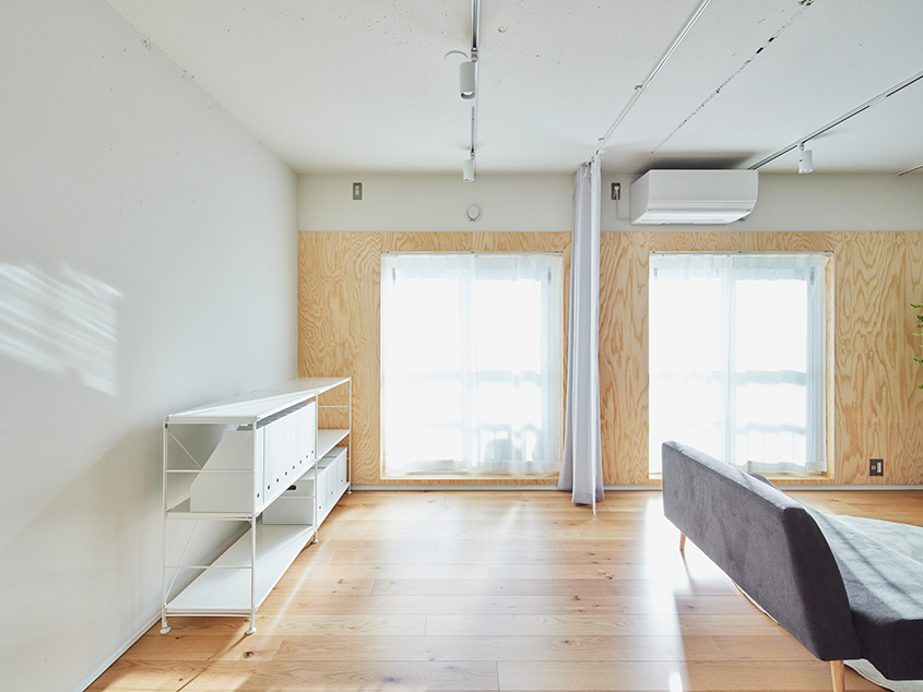 大きな窓からたっぷりと光が差し込むリビングは、壁面に合板を使いました。お部屋全体を明るく見せてくれると同時に、木目の暖かみが感じられます。カーテンで空間をゆるやかに仕切って、書斎や寝室を増やすことも。