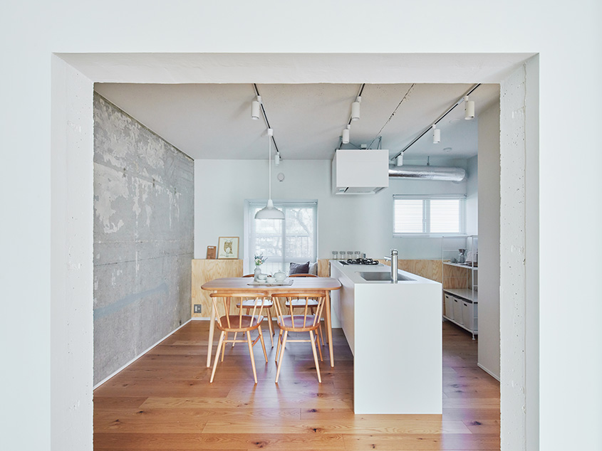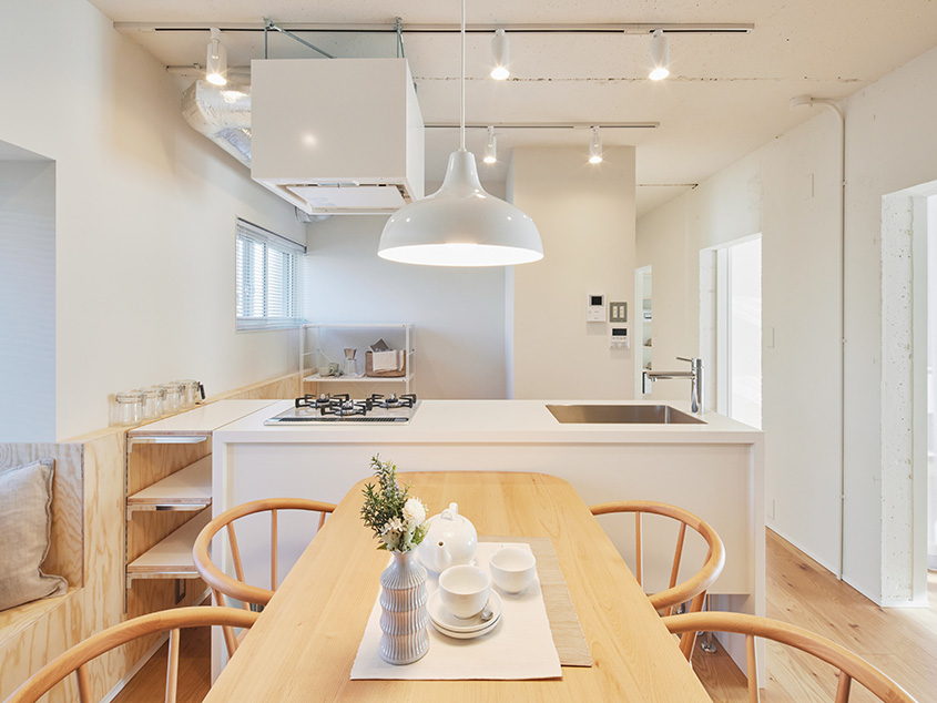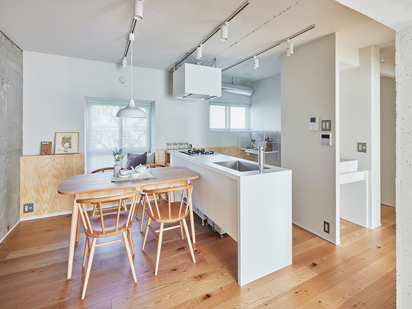 リビングと向かい合うキッチンダイニングは、「MUJI×UR」が開発した組合せキッチンを採用。壁付けタイプから対面式に変更しています。キッチンカウンターの下や背面にラックやワゴンを置いたり、かごやボックスで仕分けたり、自分の使いやすい収納にアレンジしてみてください。
