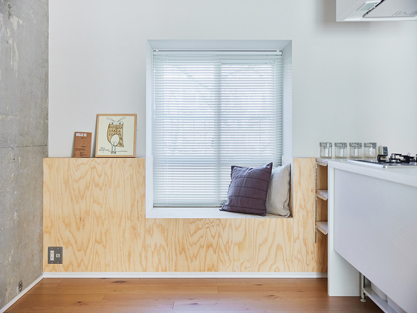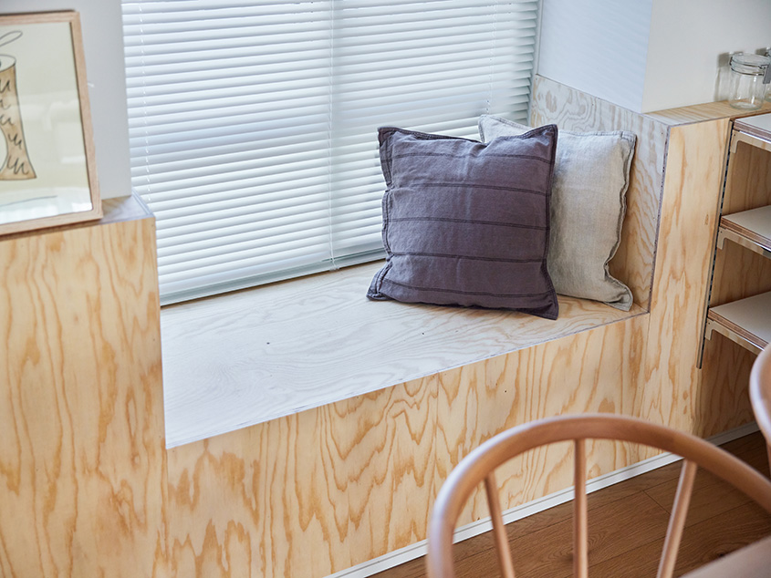 キッチンからダイニングを繋ぐ壁には、腰高のカウンターを設置。調味料やパスタを入れたキャニスター、お気に入りのお料理本、ちょっとしたグリーンを飾ってもいいですね。このカウンターでダイニングにある出窓の奥行きを増やして、ヌックのようなおこもりスペースも作ってみました。ひと息つきたいときはここに座って、コーヒーを飲んだり本を読んだり、お天気のいい日にはウトウト……なんて幸せな想像が膨らみます。