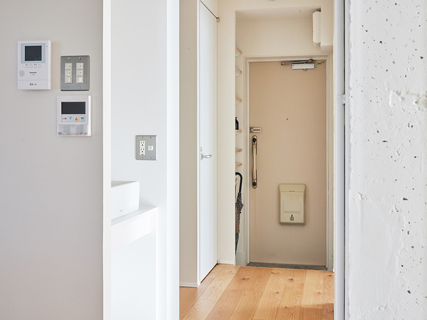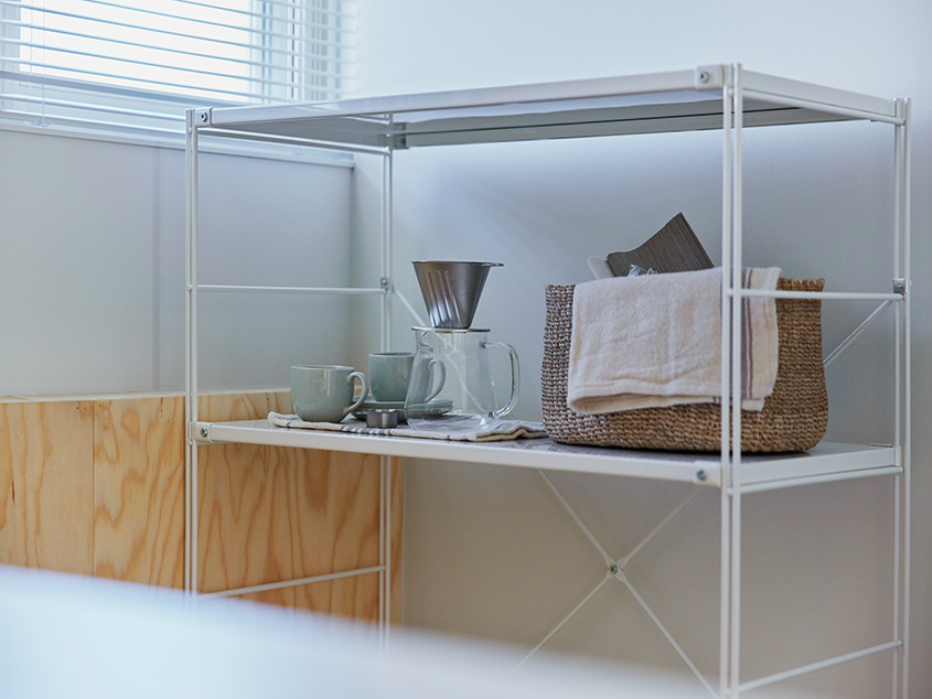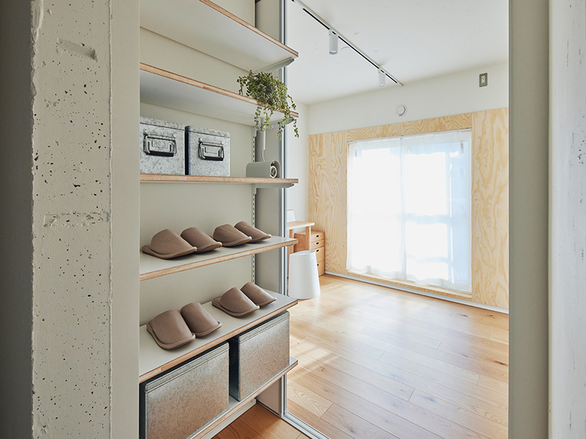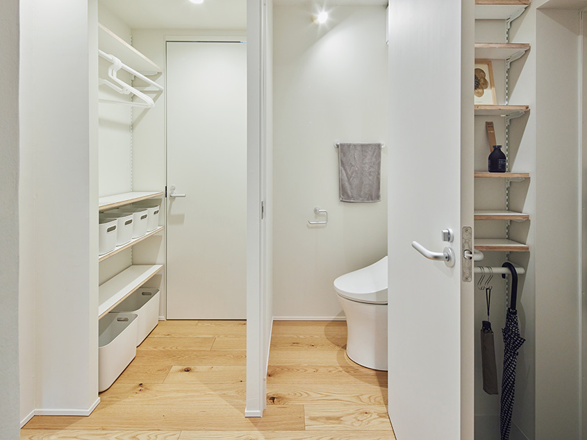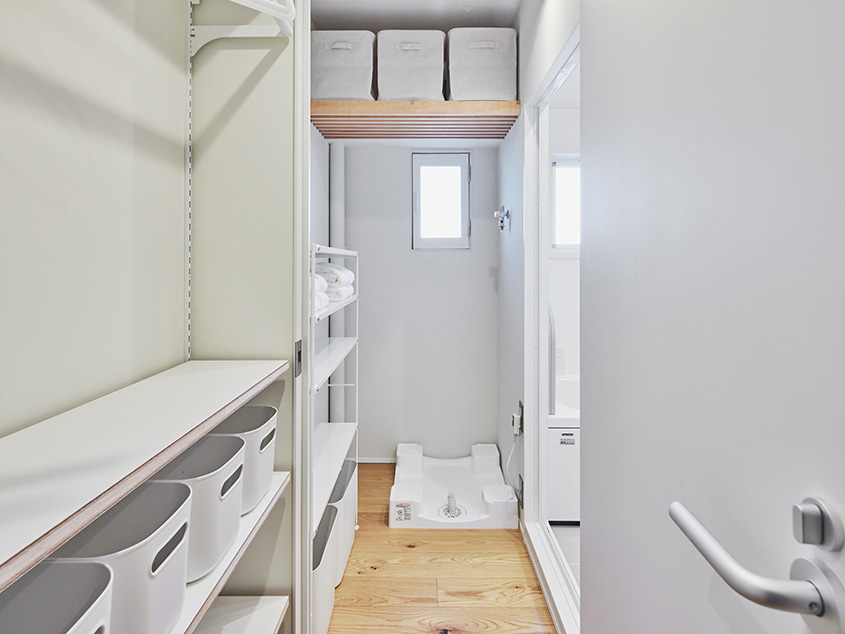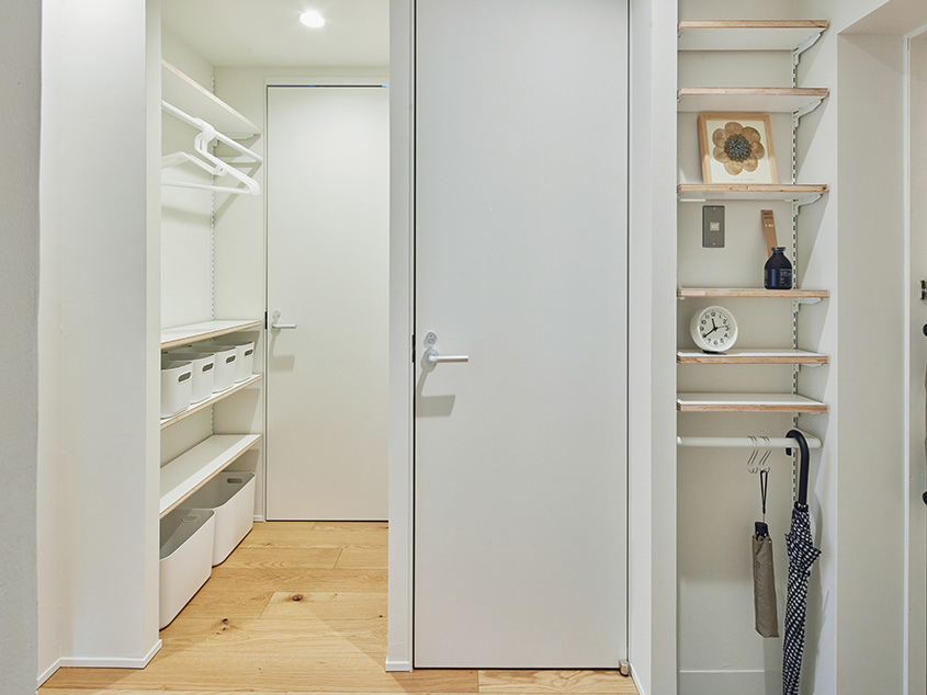 このお部屋で一押しのポイントは、地味にすごい収納力。玄関には可動式の下足棚を2カ所と、傘やエコバッグを吊るせるハンガーパイプが。洗面室の洗濯機上には、明かりを遮らずハンガーもかけられるルーバー棚を。その場所で使うもの、それぞれの居場所を決めることで片付けもスムーズになりそうです。洗面室と廊下の間には、どの部屋にも属さない「なんでも収納」を用意しました。日用品のストックや、バスグッズ、アウトドア用品や掃除用具をしまっておいたり、ハンガーパイプがあるので洗濯物の一時置き場にしたり、お気に入りを並べる飾り棚にする等、可能性は無限大。ロールスクリーンをつけて目隠しすれば、生活感も気になりません。