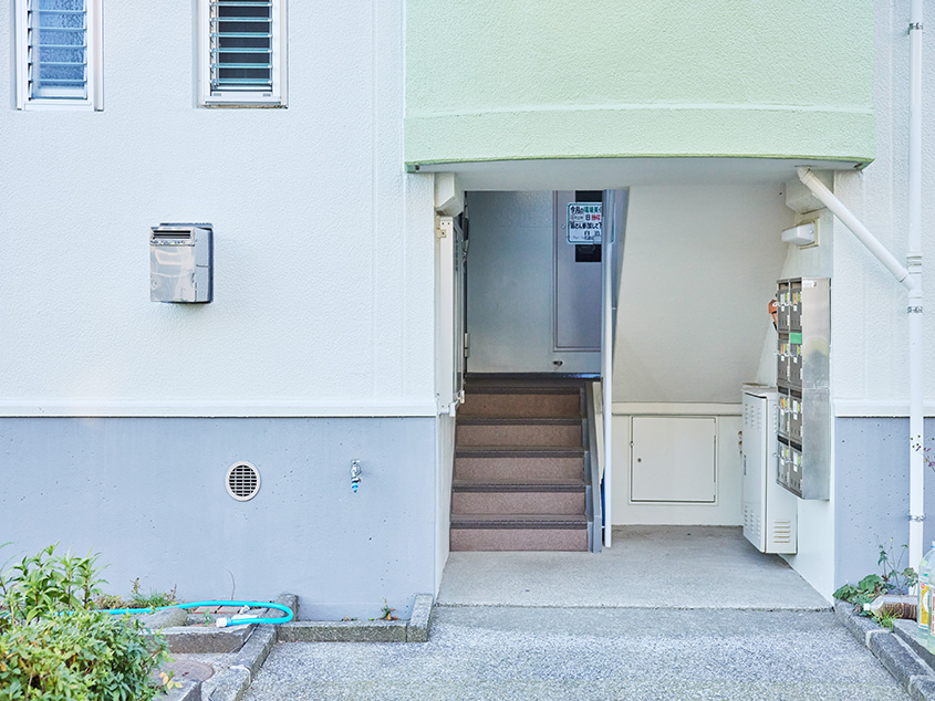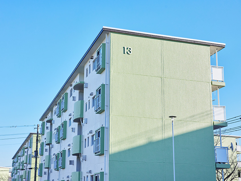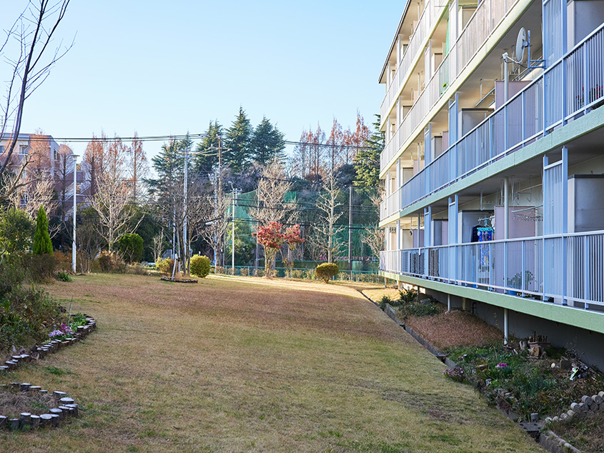 今回リノベーションしたお部屋があるのは、神奈川県横浜市にある上中里団地の8号棟。目の前が小学校、その先は大きなゴルフ場になっていて、すぐそばにハイキングコースがたくさんある自然たっぷりの場所です。3階のお部屋なので眺望も良く、慣れてしまえば階段の登り降りも気にならないはず。リノベーション前はお部屋に段差がありましたが、それらをすべて無くしてバリアフリーに生まれ変わりました。