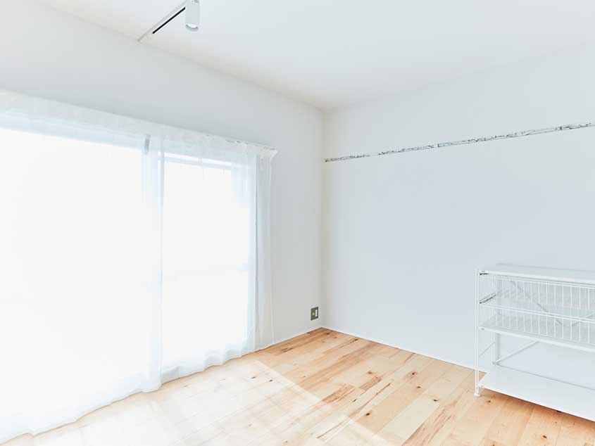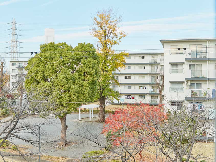今回リノベーションを行ったのは、片倉台住宅。エレベーターのない5階建て4階のお部屋です。お部屋の南側が公園となっており、視界を遮る建物がないので陽の光が気持ちよく入ってきます。