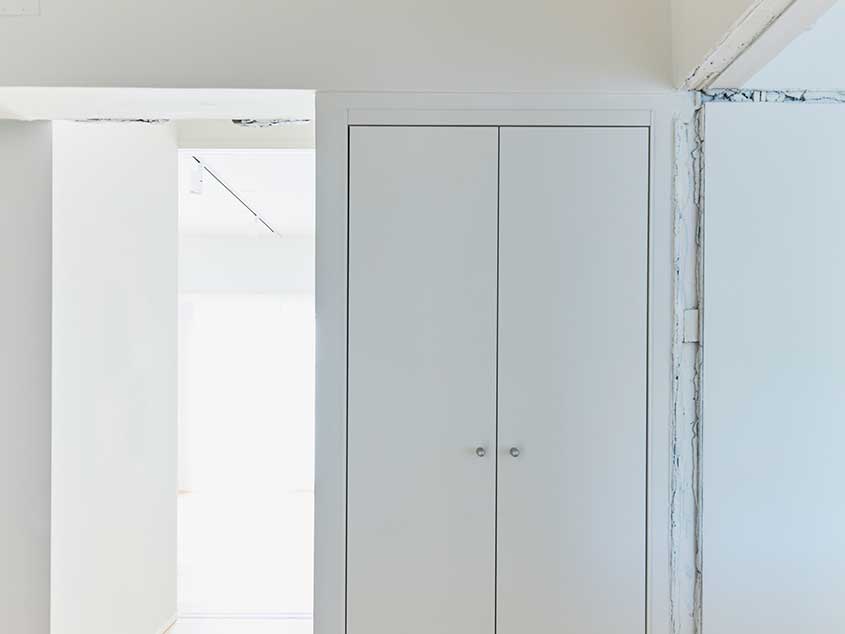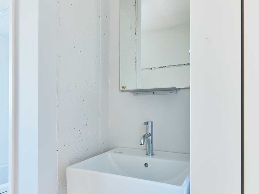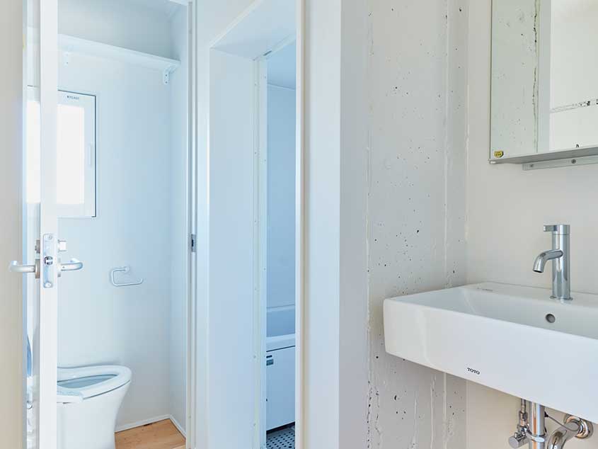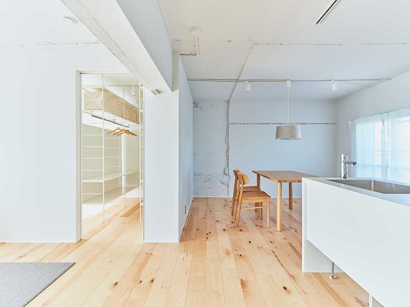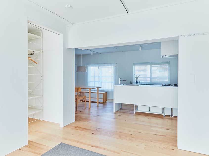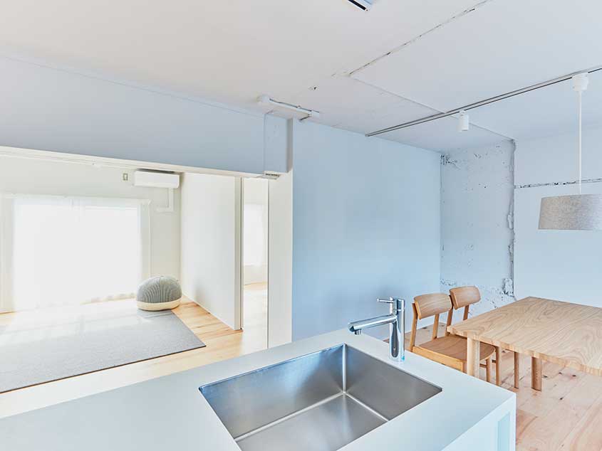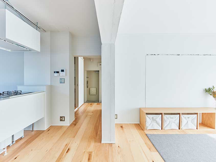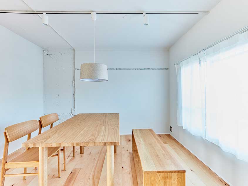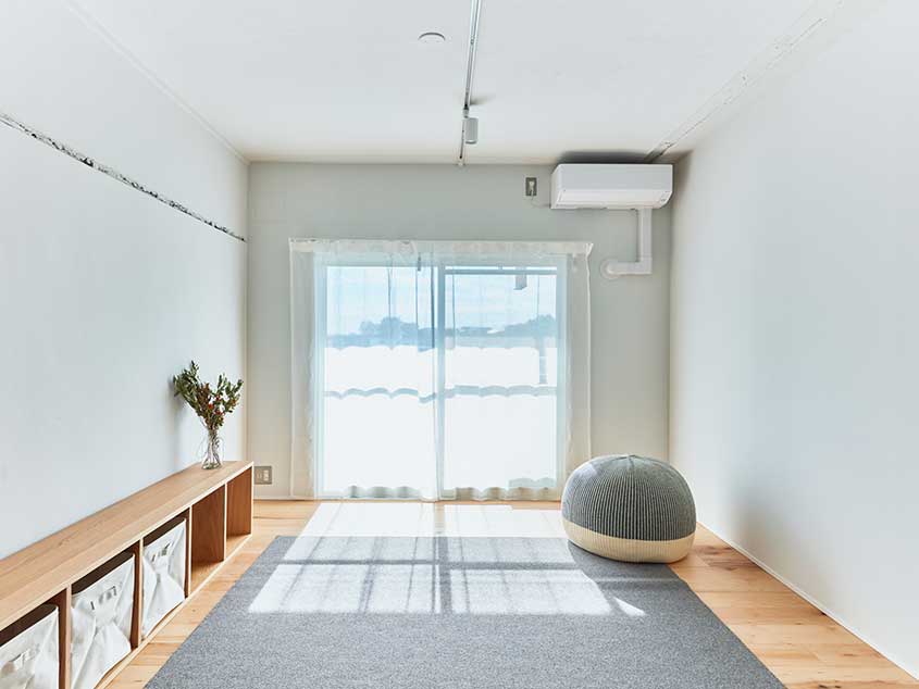 1969年築63.43㎡のお部屋をいまの暮らし方に合うようリノベーションしました。天井と外壁面には断熱材を入れ、窓にはインナーサッシを設けることで一般的に寒暖差が激しくなりがちな最上階の住戸の温熱環境を改善しています。南側の窓から入る暖かな光と、気持ちよく抜ける風を感じられる団地の良さを生かしたお部屋になっています。
