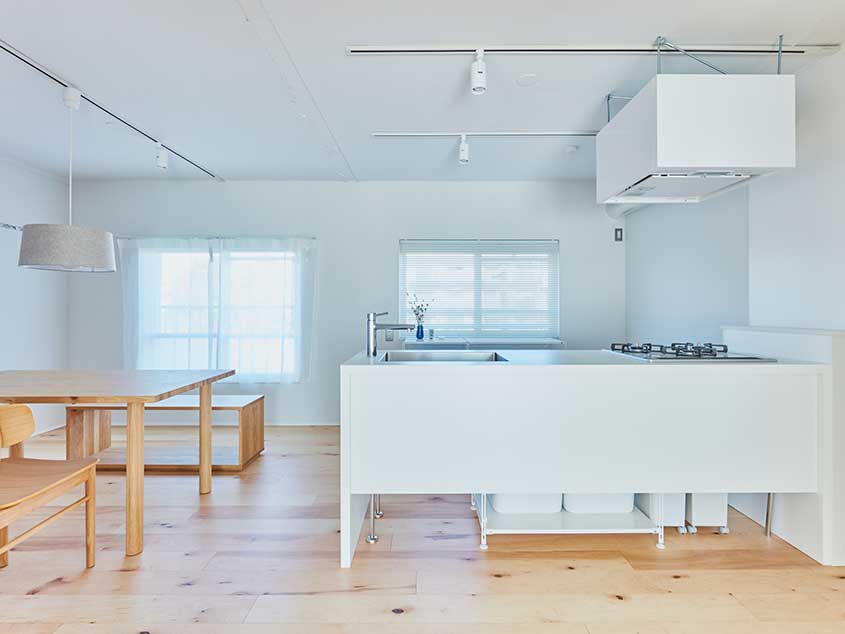 お部屋の中心にキッチンを配置し、リビングとダイニングを緩やかにつないでいます。キッチンを対面式にすることで、家族の様子を見ながらお料理をすることでができます。背面にも窓あるので、明るく開放的なキッチンとなっています。