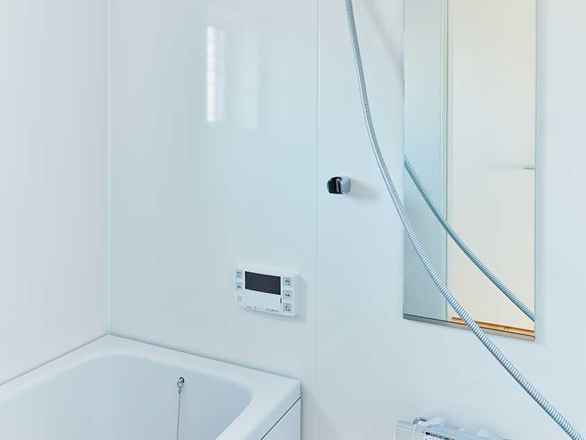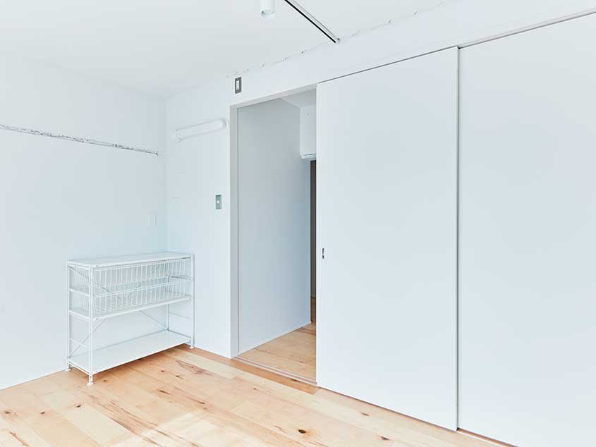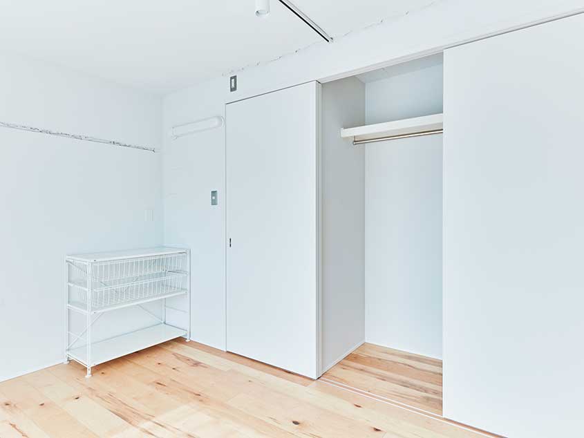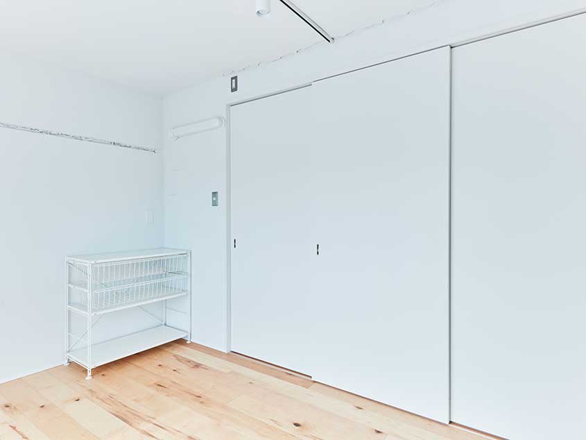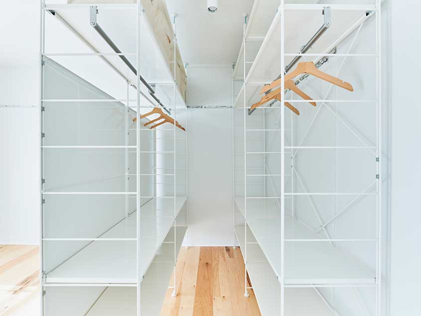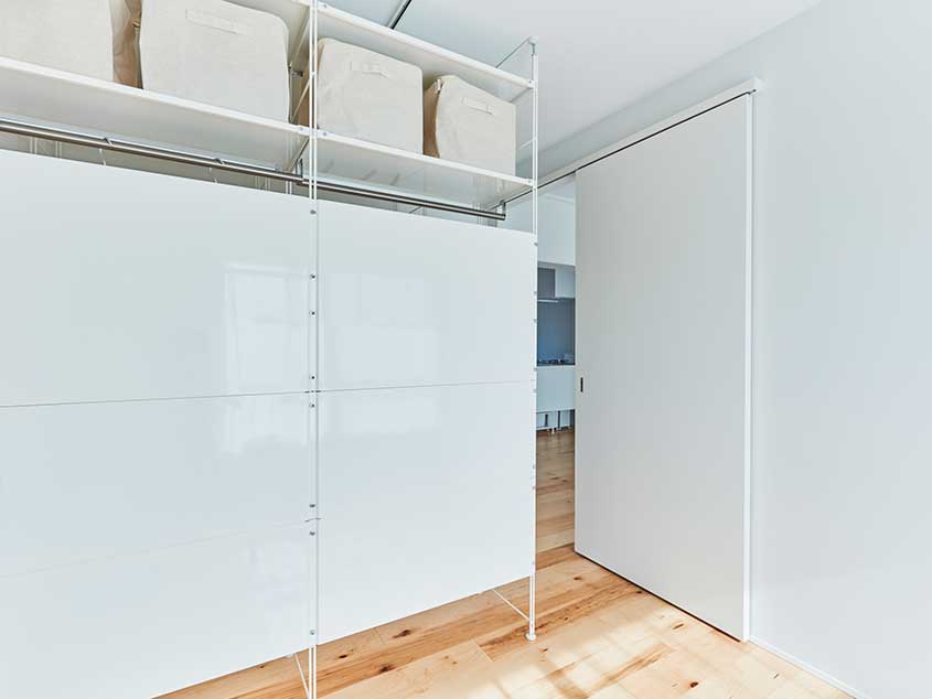 個室は2部屋設けています。また、LDKの一部を無印良品のユニットシェルフで間仕切ことで、テレワークスペースや子ども部屋としても活用できます。普段は広いリビングとして使うことができるので、お部屋を余すことなく使うことができます。