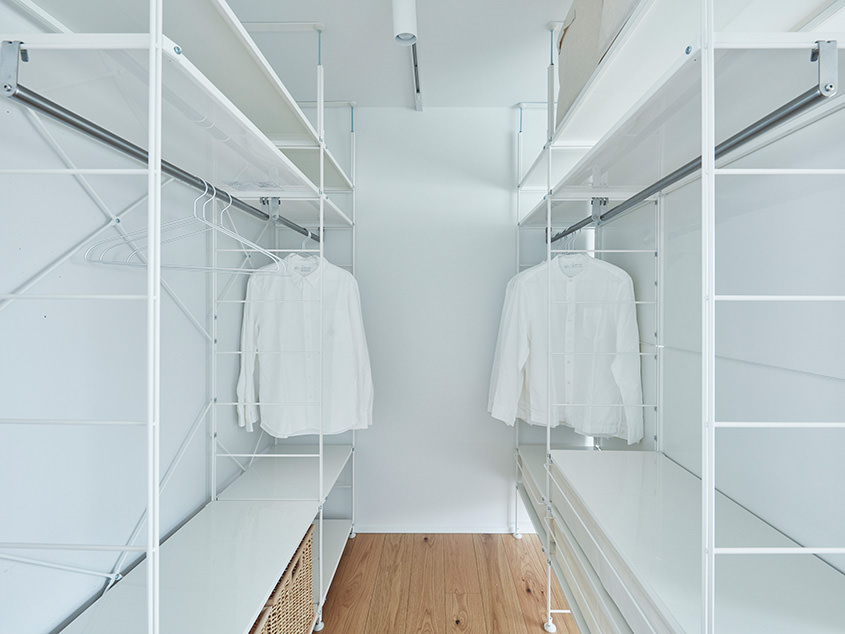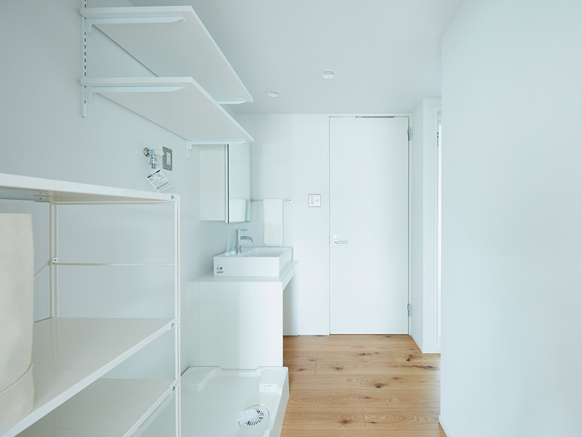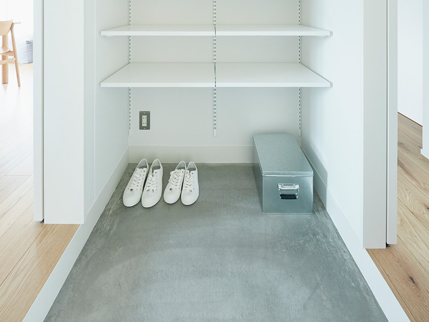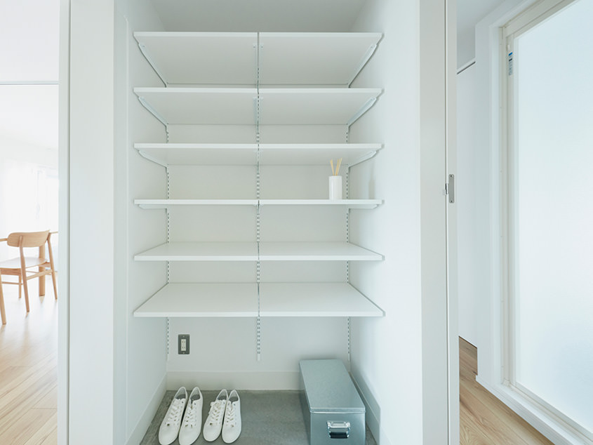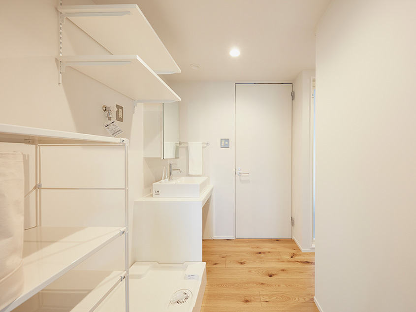 玄関には壁一面に可動棚収納を設けました。下足棚としての利用はもちろん、ちょっとしたアウトドアグッズや、お子様の外遊び道具も収納することができます。玄関から直接や洗面にアクセスできるので、リビングを通る前に手を洗ったり汚れたものをすぐに洗濯機へ放り込んだりすることもできます。洗面室はゆったりした広さを確保しているので、朝の身支度や家事もしやすくなっています。