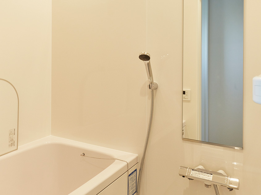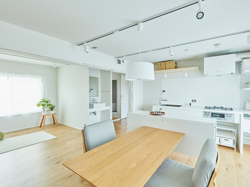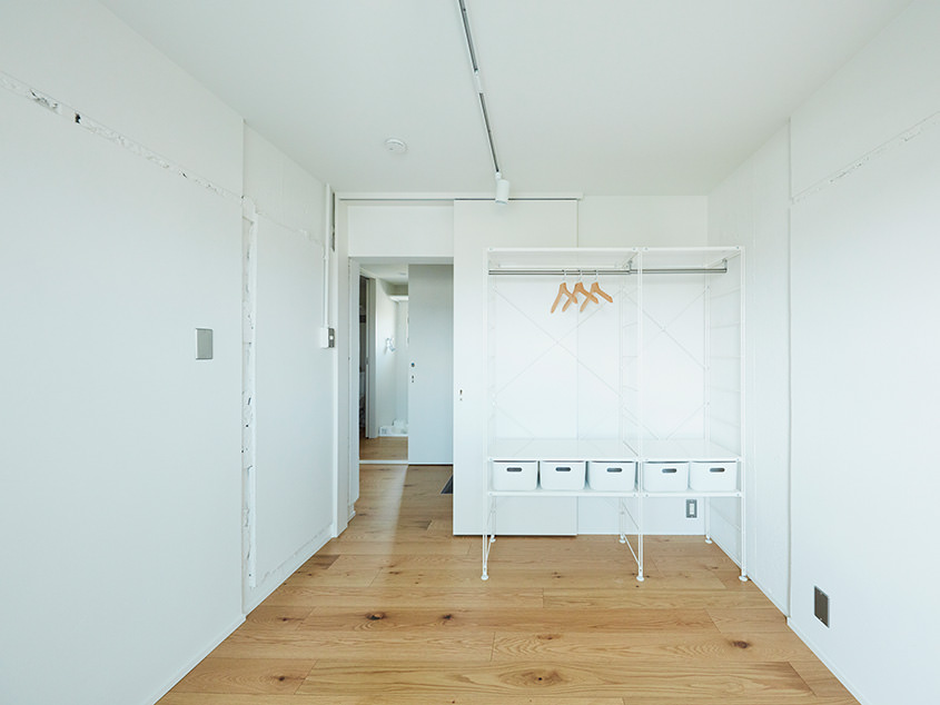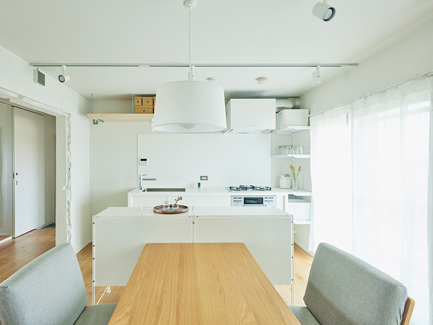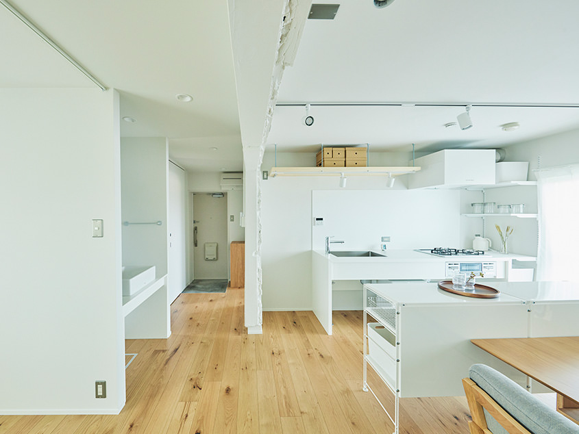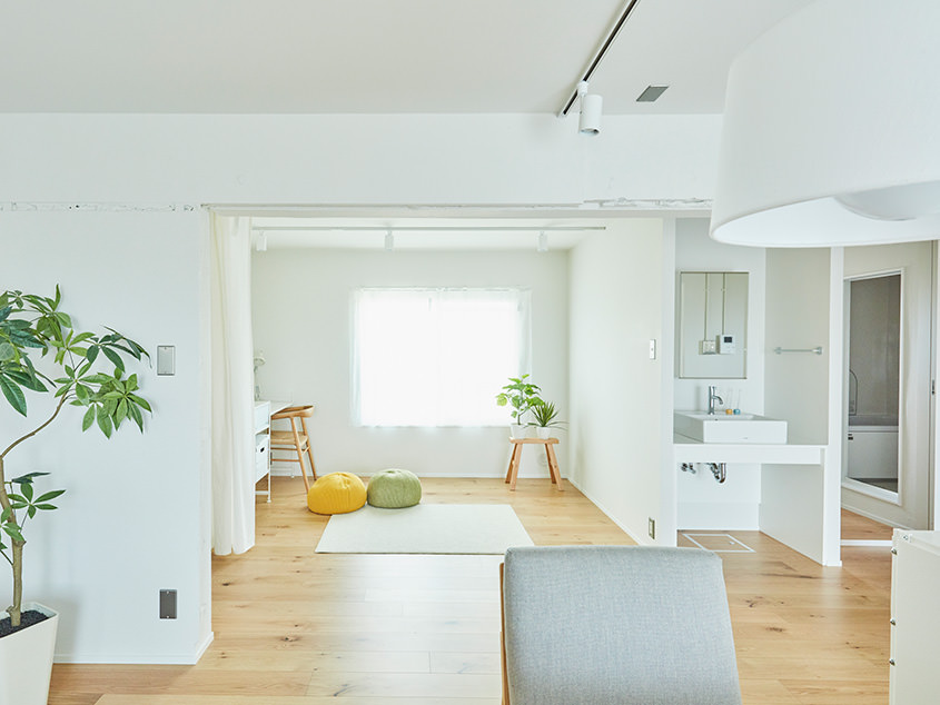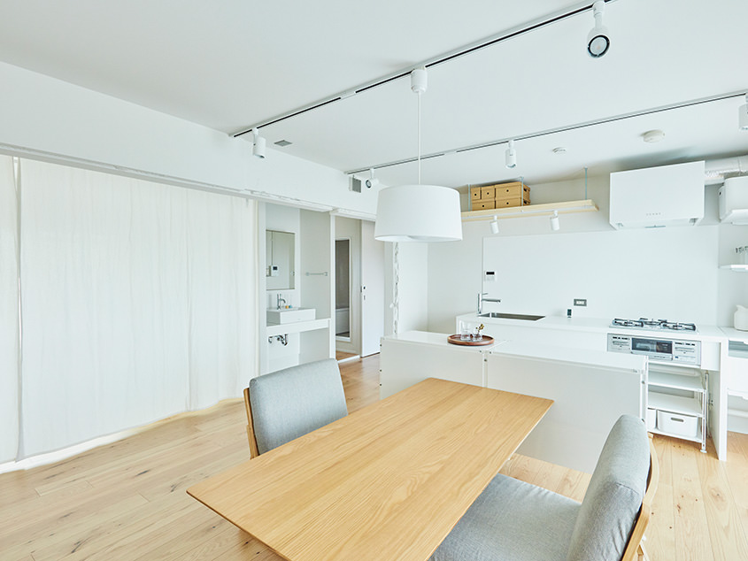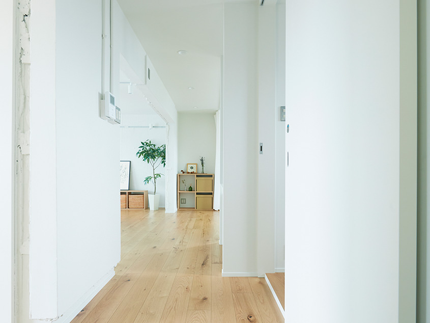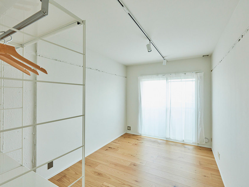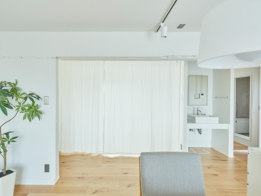壁式構造で変えることのできない壁を活かし、間取りを整えました。外壁面には断熱材を入れ、窓にはインナーサッシを設けることで一般的に寒暖差が激しくなりがちな最上階の住戸の温熱環境を改善しています。南北に付いている窓を開けることで、お部屋全体を光と風が通り抜けます。