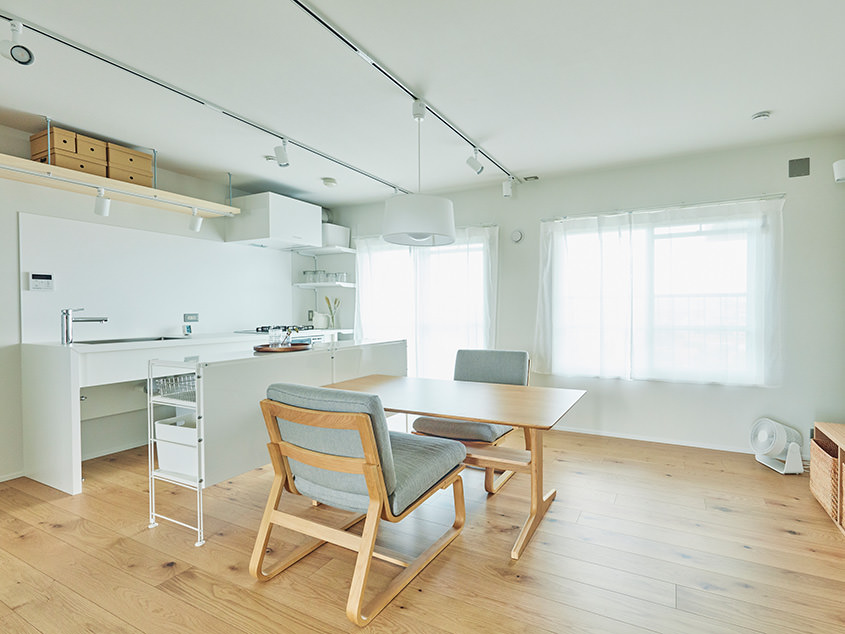 リビングとダイニングキッチンは廊下を取り込み一体的に使うことができます。キッチンを壁付型にしているので、空間を目一杯広く使うことができます。南北の窓を開けると気持ちい風が通り、とても明るい印象です。