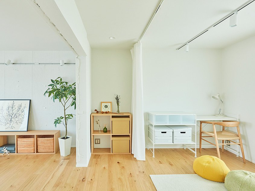 リビング部分は天井に設けたカーテンレールで、緩やかに仕切り個室として利用することもできます。カーテンを利用することもできます。風通しを遮ることもなく、寝室や、ワークスペースとしても活用できそうです。