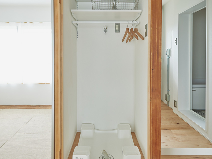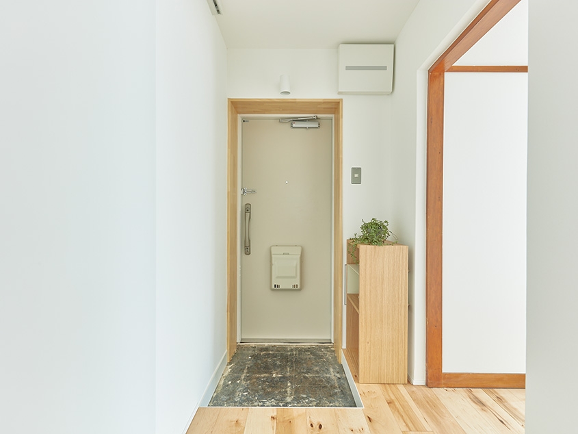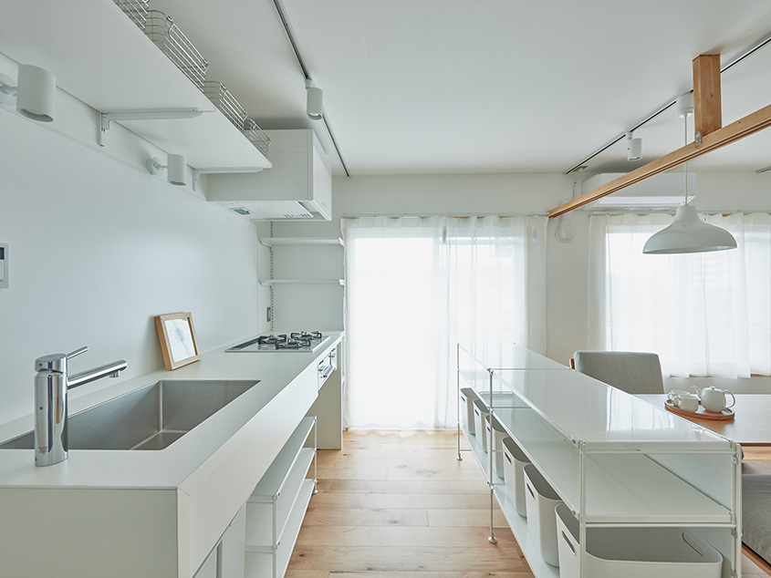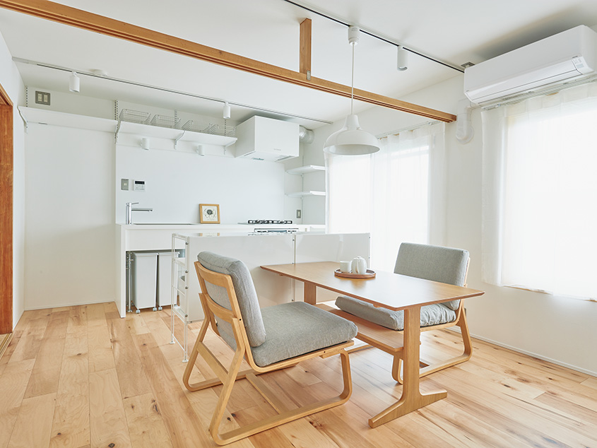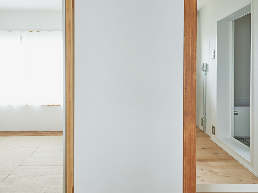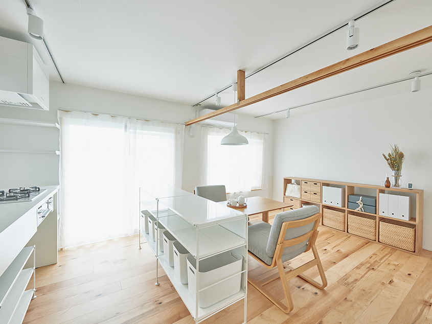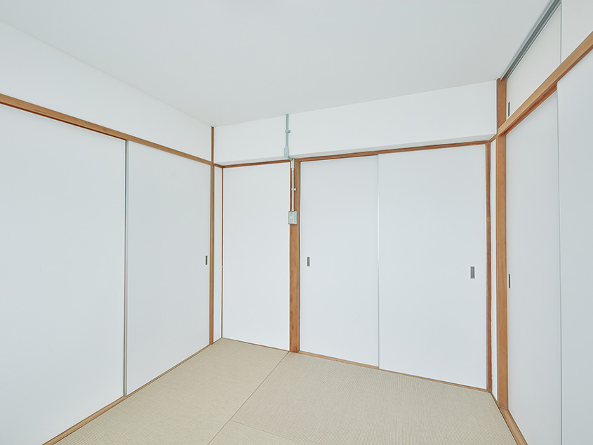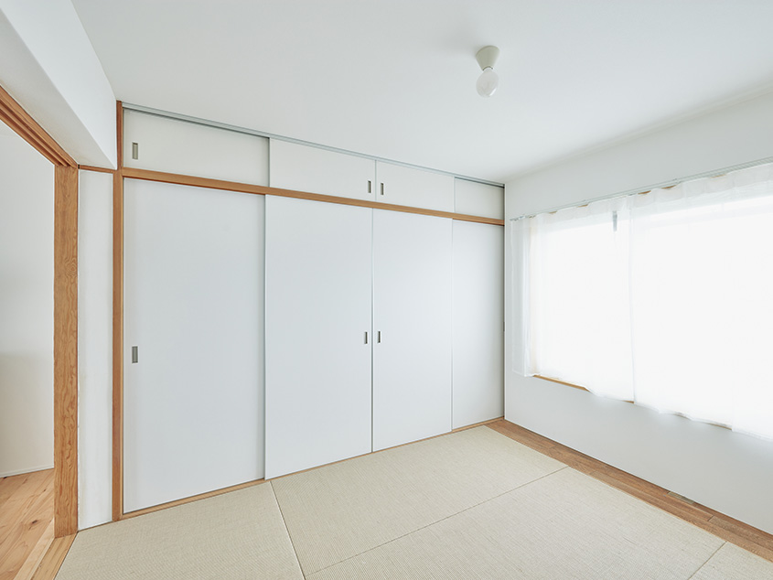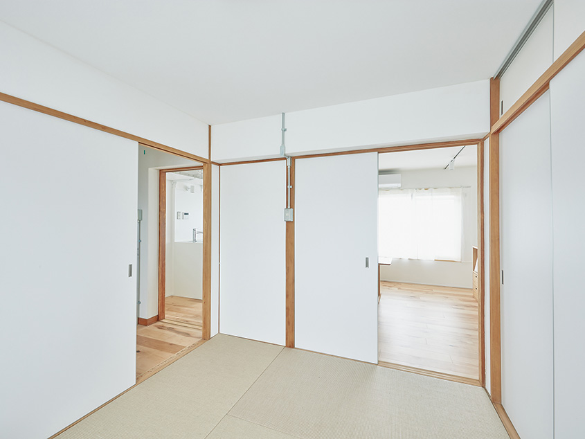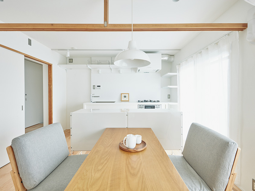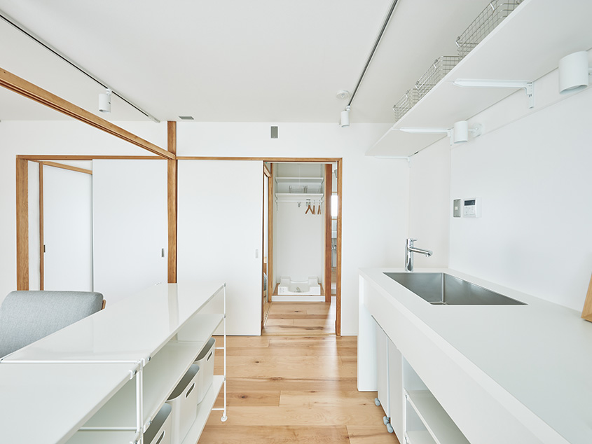 数ある団地の中でも、代表的な階段室型の住戸をリノベーションしました。標準的な他の字型の間取りをベースに、設備を更新し、暮らしやすくなるよう断熱性能を向上しています。和室にもともとあった押入をそのまま生かしているので、収納量は十分確保されています。