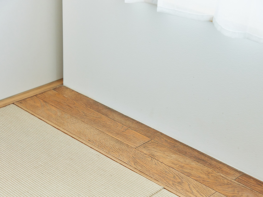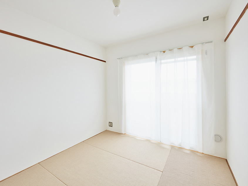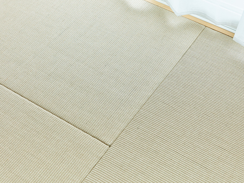 和室では、MUJI×UR団地リノベーションプロジェクトで開発した麻畳とダンボールふすまを採用しています。麻畳は、直に座っても気持ちの良い質感なので和室として使っても、家具を置いて洋室として使っても、どちらの暮らしにもフィットするのが特長です。