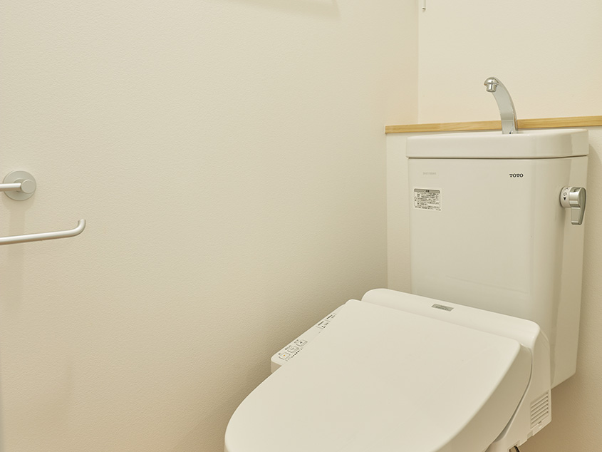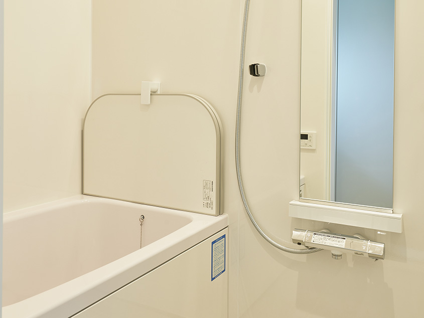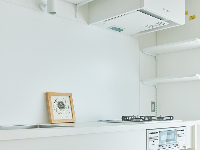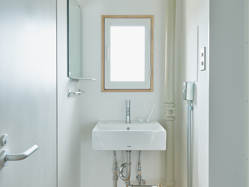 キッチンはMUJI×UR団地リノベーションプロジェクトで開発した組合わせキッチンを採用しています。設備機器(洗面・トイレ・お風呂)は新規で交換しています。水まわりのスペースはコンパクトにまとまっているので、無駄のない空間になります。
