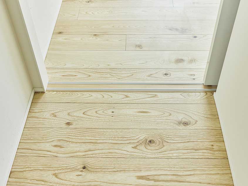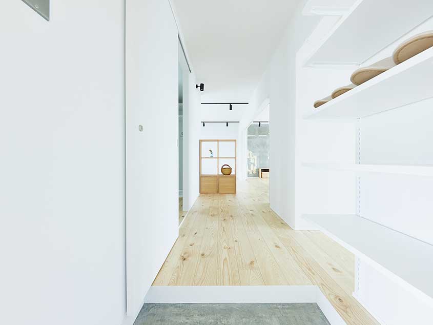 玄関から続く廊下はゆったりと広く、飾り棚を置いたり小さめの家具で緩やかに仕切ったりすることも可能。広い廊下のおかげで玄関にも明るい光が入り込みます。