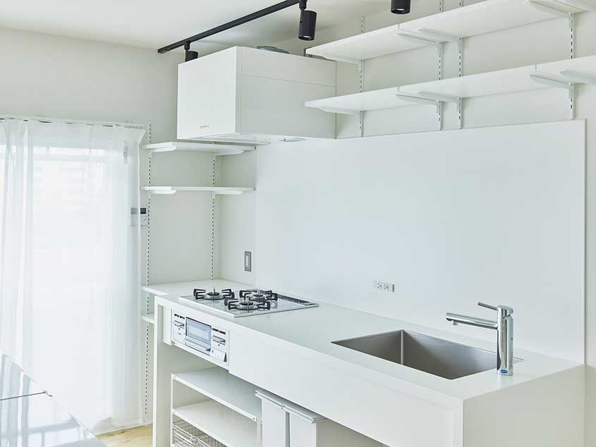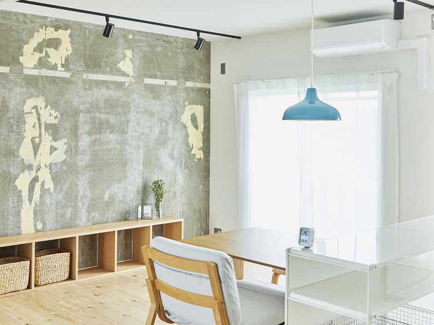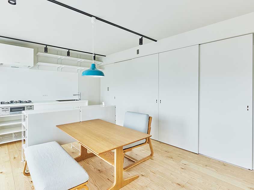 大きな2つの窓があるダイニングはとても明るく、まさに家族団欒の空間。あえて塗装をせず、コンクリートをそのまま見せた壁がアクセントになっています。キッチンはシンク上部とコンロ横に設置された可動式の棚や、スチールラックもあり、収納も自由に組み合わせることができます。ダイニングと隣の個室は4枚の引戸で仕切られていますが、引戸を開けることで大きなリビングダイニングとして使うことも。来客時や生活スタイルの変化などに合わせ、フレキシブルに間取りを変えられます。