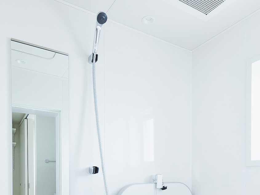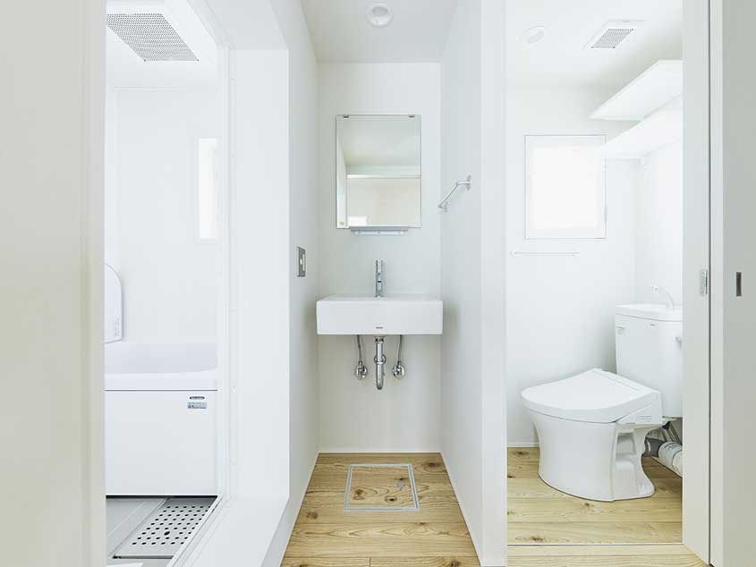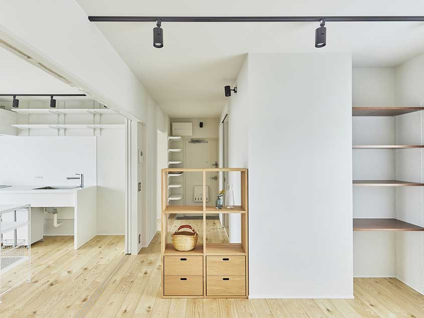 玄関には下足用に可動式の棚を設置。部屋へ入ってすぐ左手に洗面室があり、すぐに手を洗うことができます。洗面室の扉は引き戸になっているため、開けておけば扉にも触れずアクセスできるので、衛生面が気になる方も安心です。