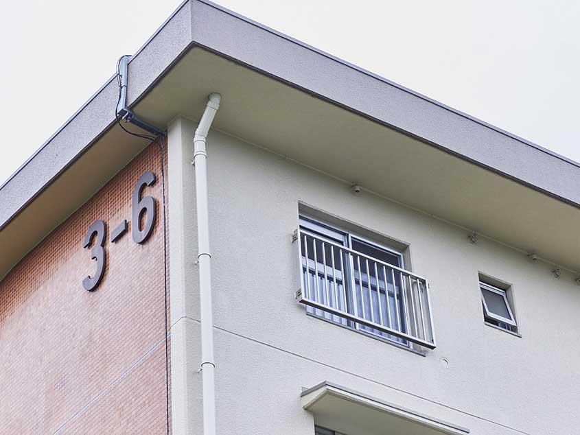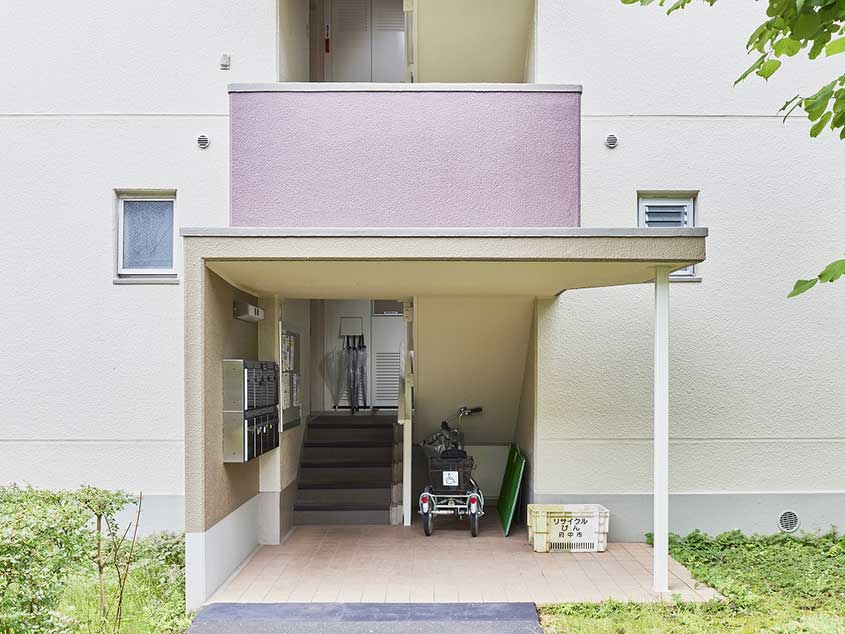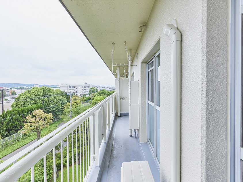 車返西住宅の最上階、5階のお部屋をリノベーションしました。周囲には緑が溢れ、目の前には公園やスポーツの競技場が並ぶ穏やかな街並みを見渡すことができます。
