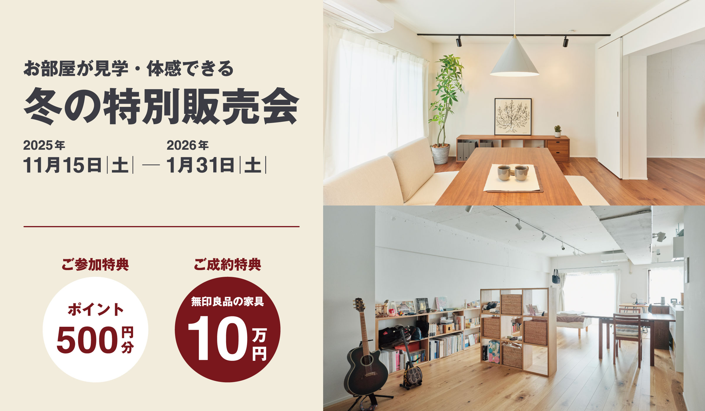 ご参加特典付きの「冬の特別販売会」は、無印良品のリノベーション済み物件を見学いただけるイベントです。