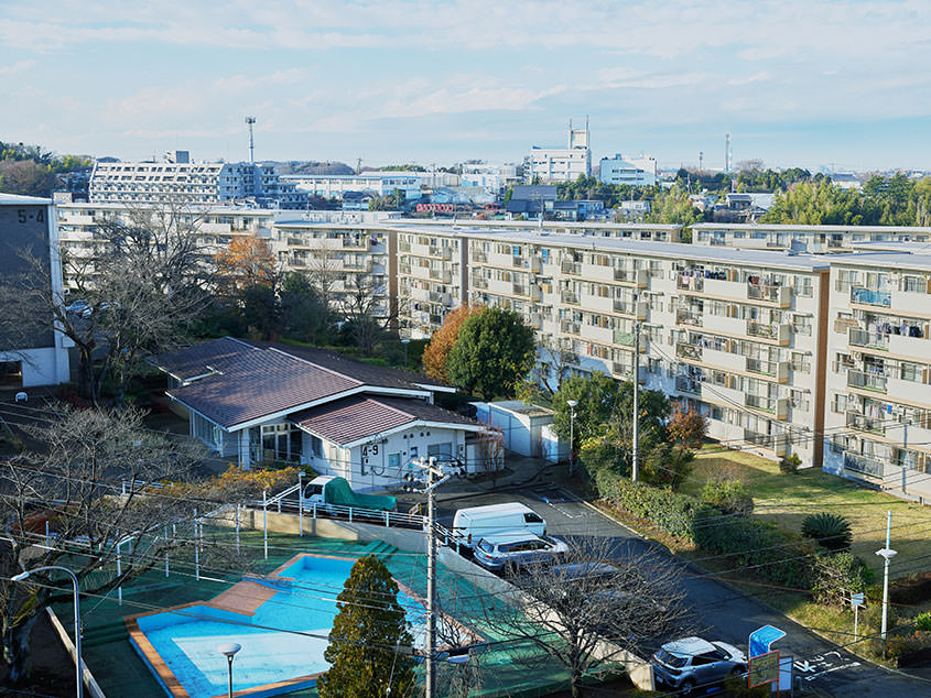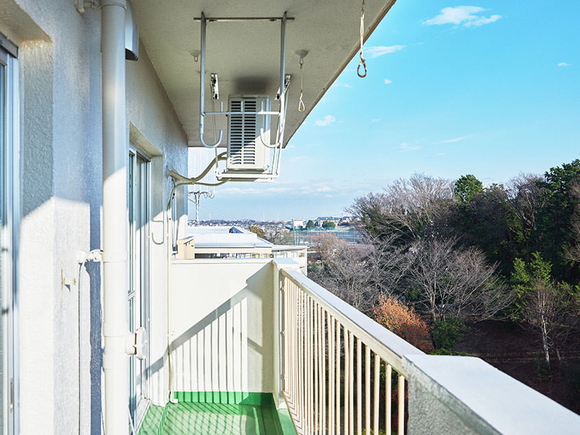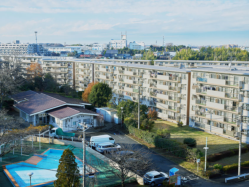 今回リノベーションをおこなったのは、5階建て5階のお部屋。エレベーターがないので少し大変ですが、まわりに高い建物がなく、ゆとりのある住棟配置なので視界が開けています。