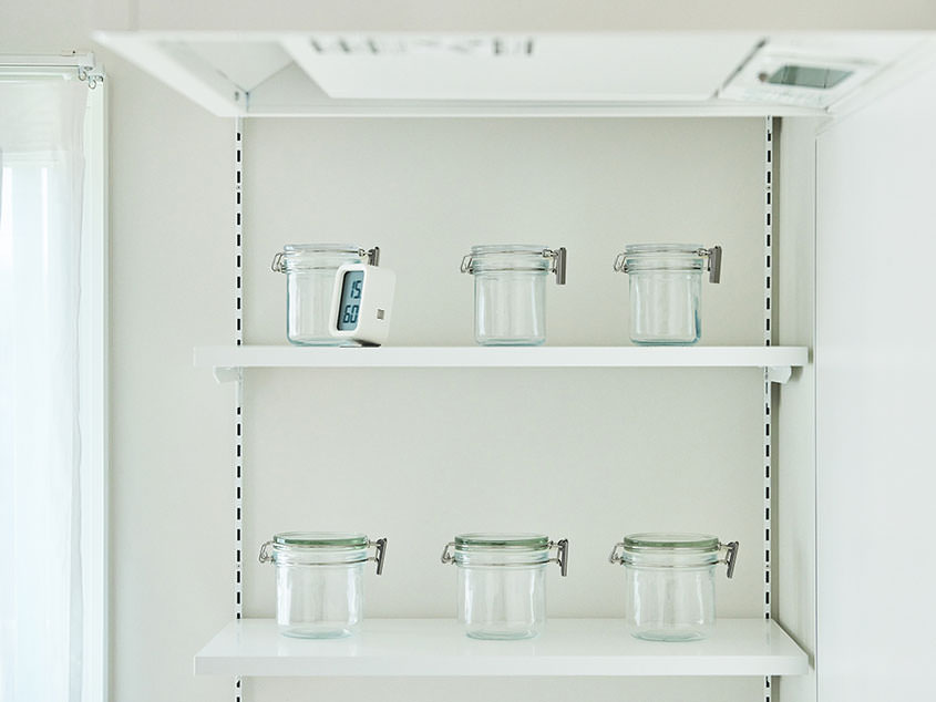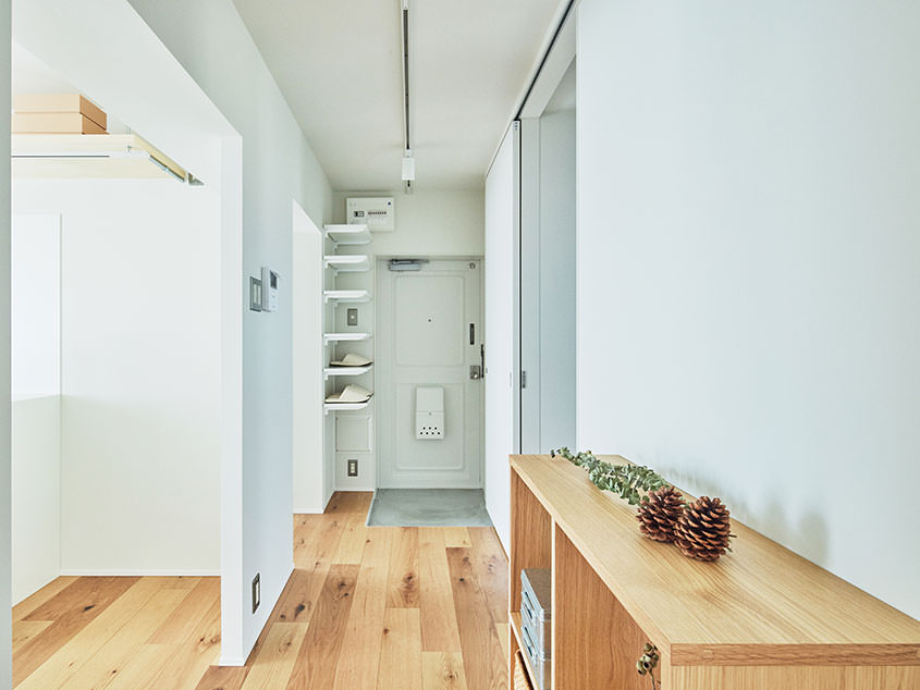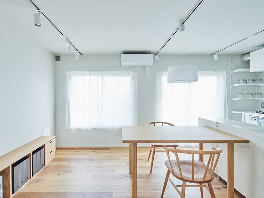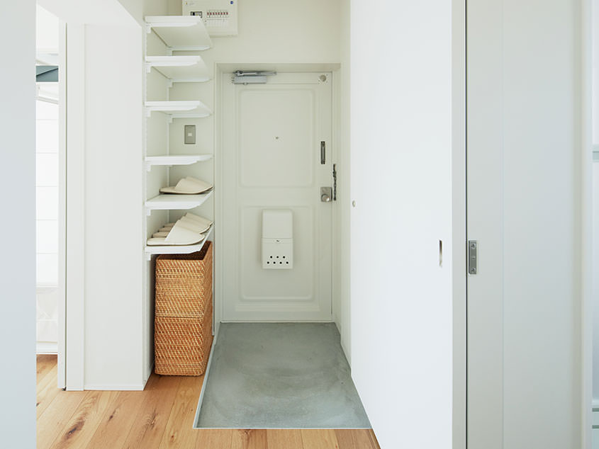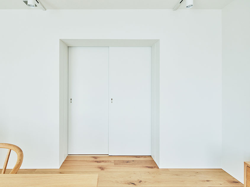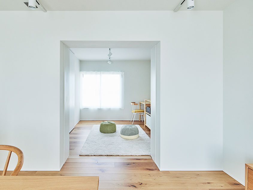 団地特有の壁式構造で変えることのできない壁を活かしながら、間取りを整えました。天井と外壁面には断熱材を入れ、窓にはインナーサッシを設けることで一般的に寒暖差が激しくなりがちな最上階の住戸の温熱環境を改善しています。南側の窓から入る暖かな光と、気持ちよく抜ける風を感じられる団地の良さを活かしたお部屋になっています。