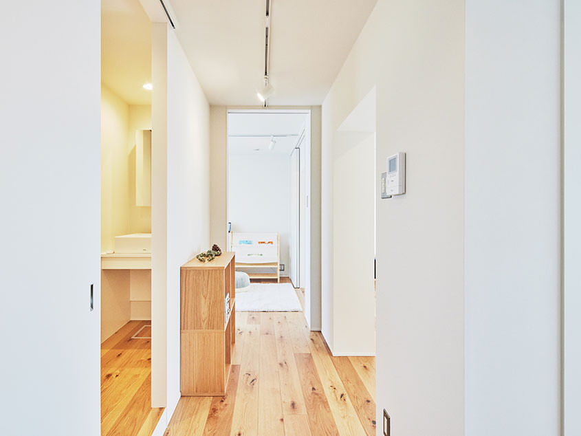 玄関土間はコンパクトですが、ホールや廊下を広く確保してあります。腰掛けベンチや収納を置いても十分な広さです。