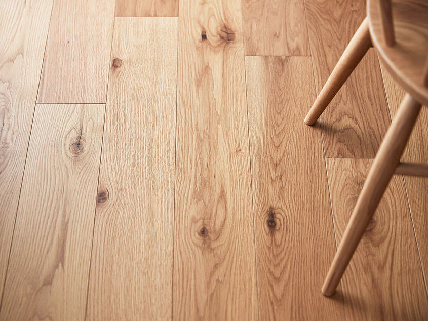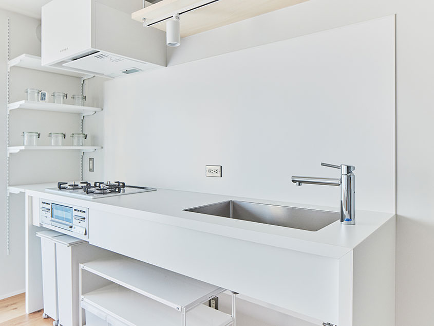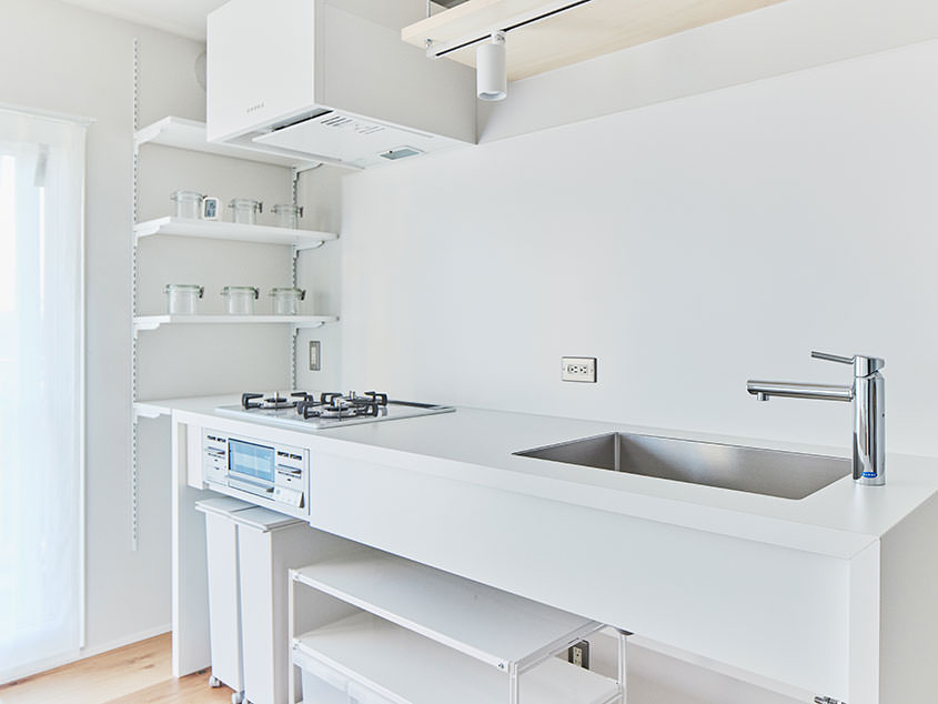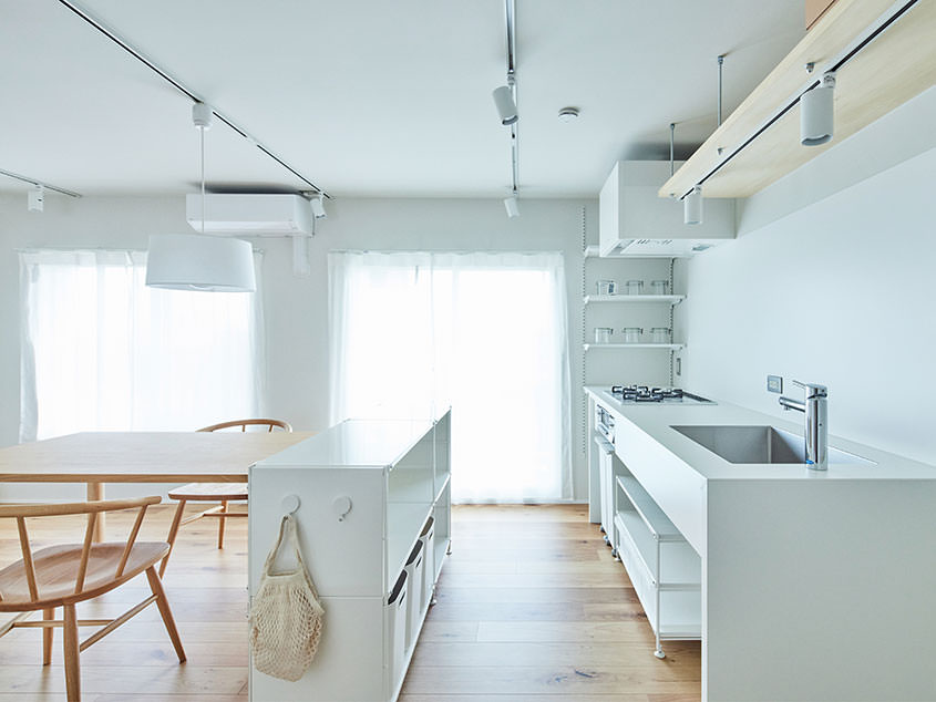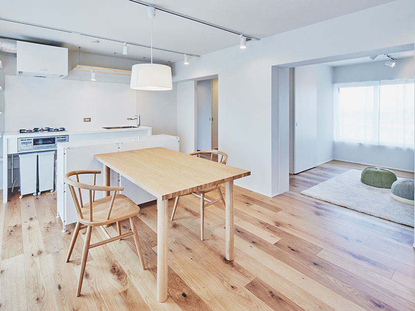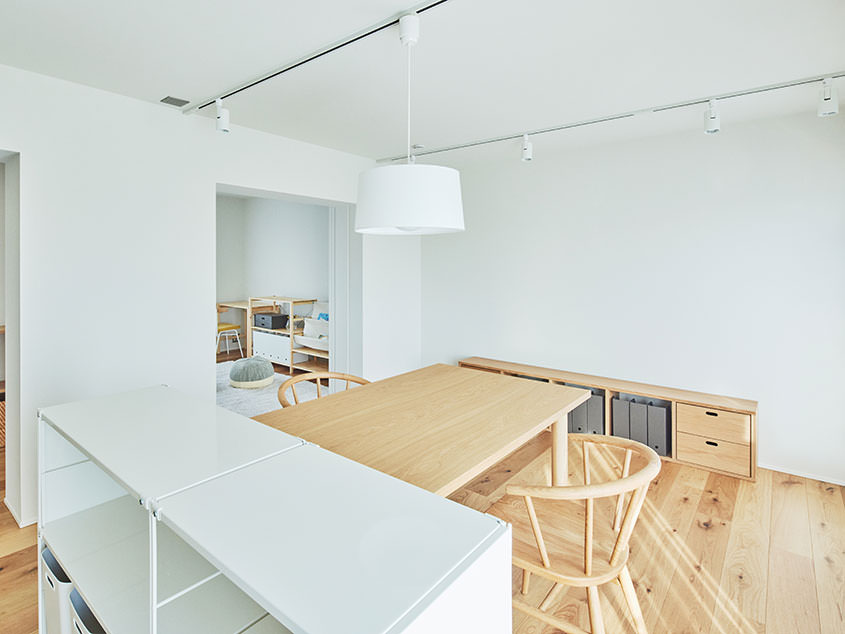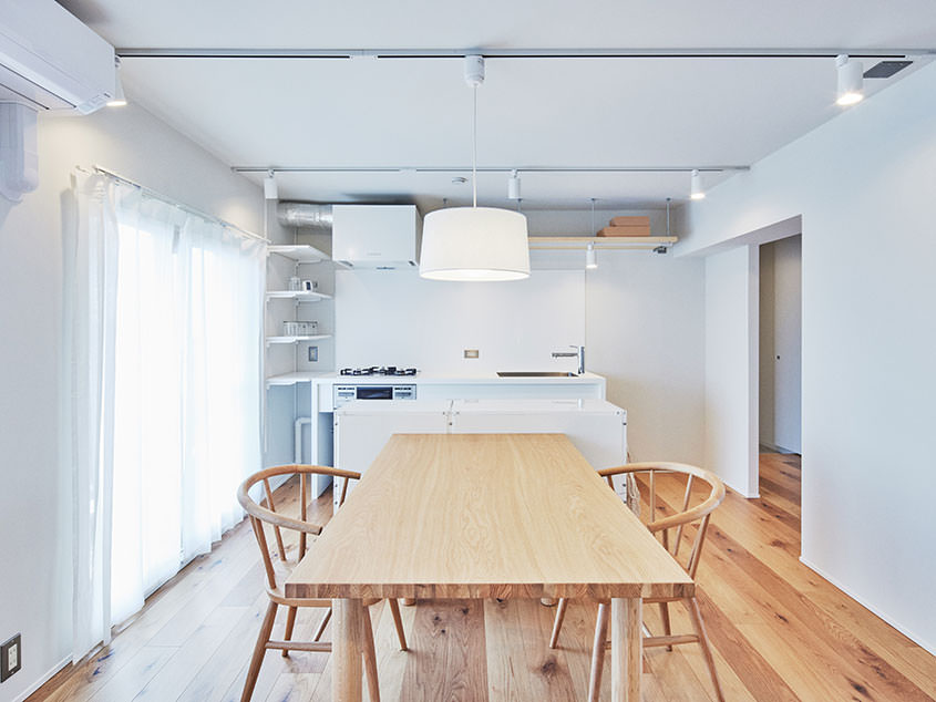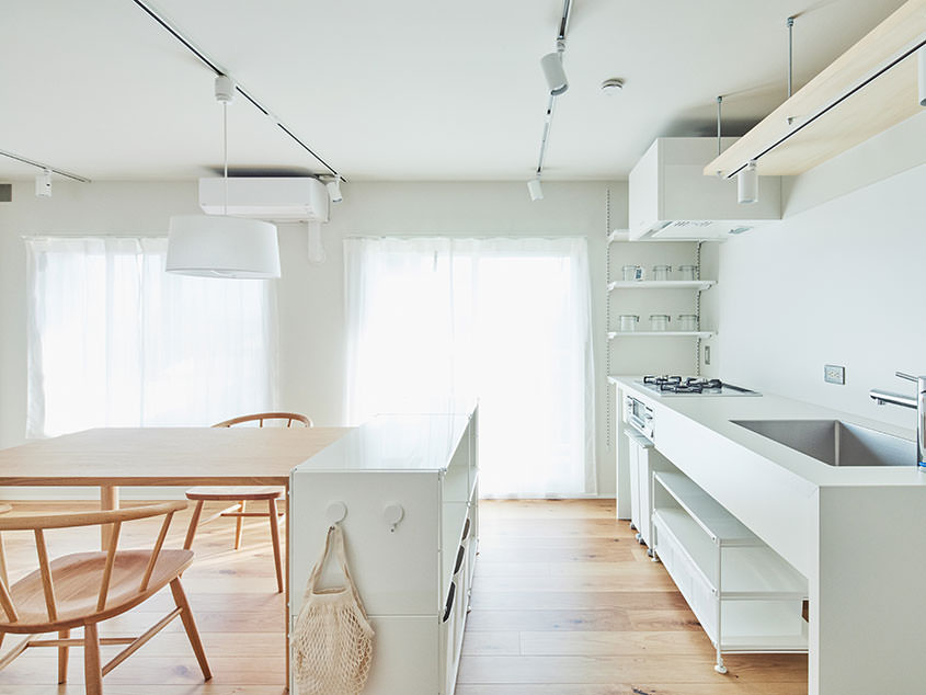 キッチンは、MUJI×UR団地リノベーションプロジェクトで開発した「組合せキッチン」を採用してます。キッチンまわりには可動棚や吊り下げ型の棚を設けています。キッチンを壁付けにすることで空間を隅々まで広く使い切ることができます。ダイニングには大きな窓が2ヶ所あり、明るく、風が気持ちよく通り抜けます。