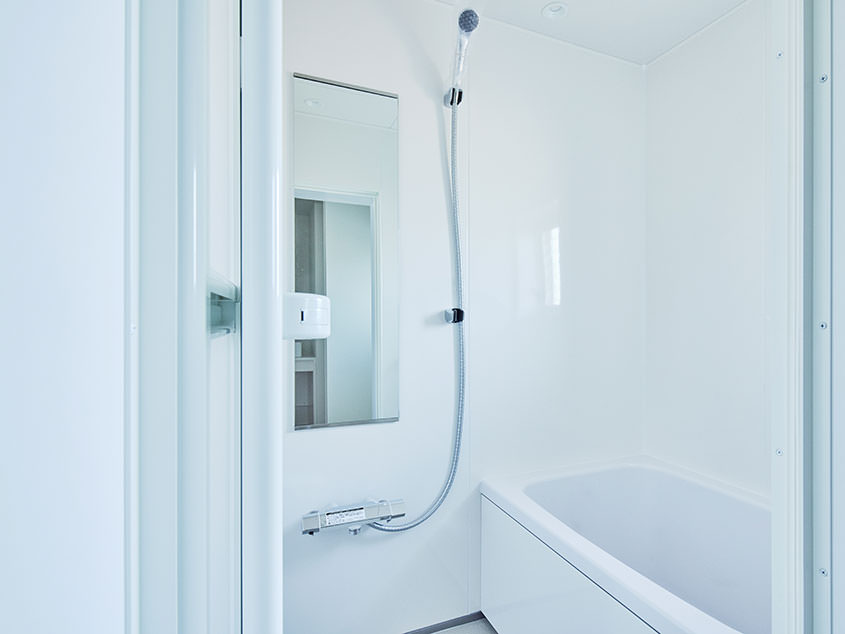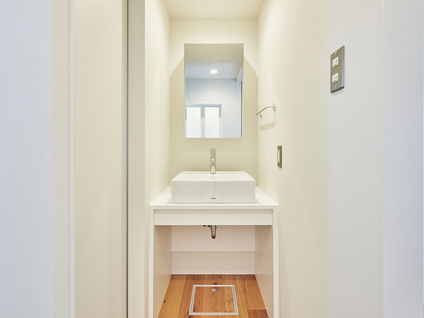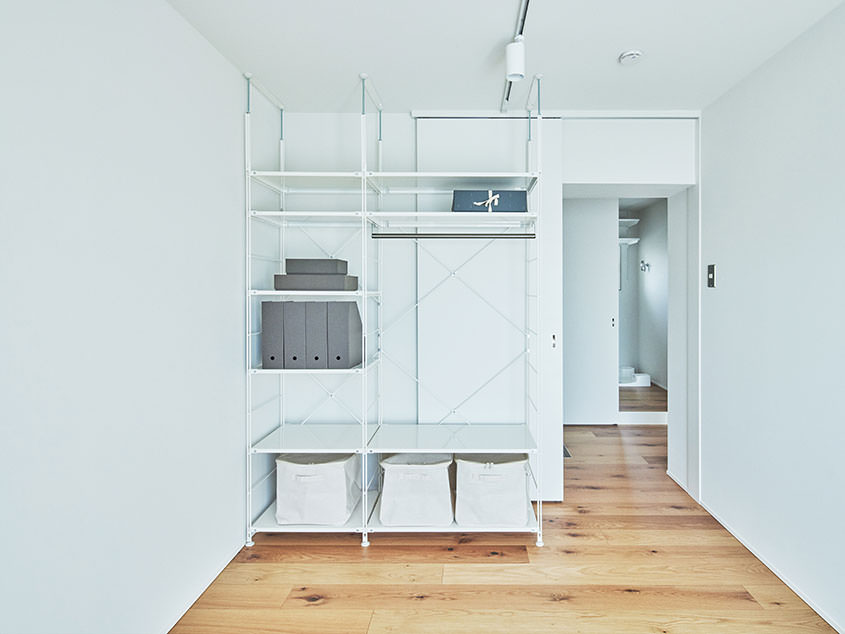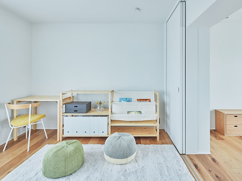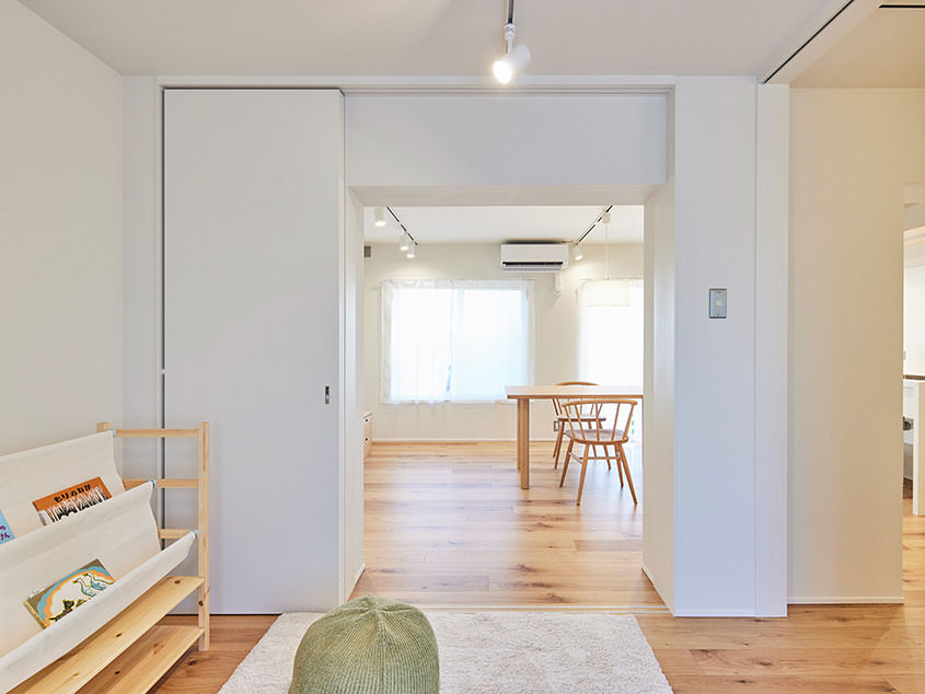 個室は、2部屋設けています。ダイニングキッチンと隣りあっているお部屋は引戸を引き込むことでリビングとして使うことができます。そのほか、テレワークスペースや子ども部屋など、用途に合わせ使い方を変えられます。ぐるりと回遊できる間取りなので、さまざまな使い方ができそうです。収納は家具を利用することで、間取りの変化にも対応できるようにしています。お風呂は既存と大きさは変わりませんが、ユニットバスへ変更することで性能面も使い勝手も改善しています。洗面脱衣室も新たに設けました。