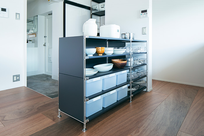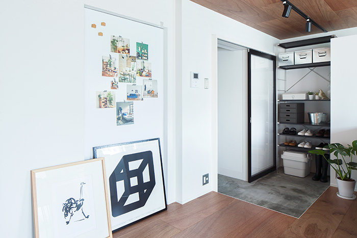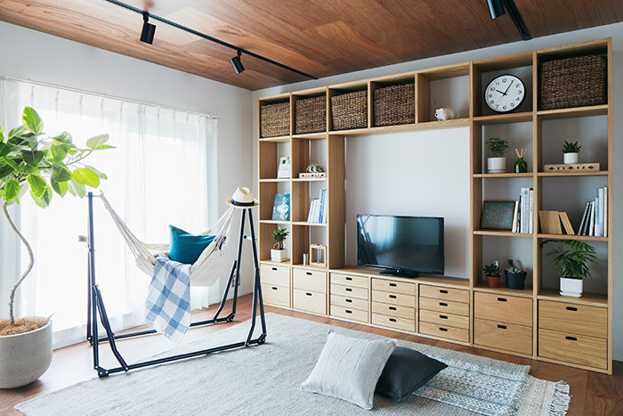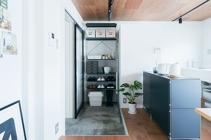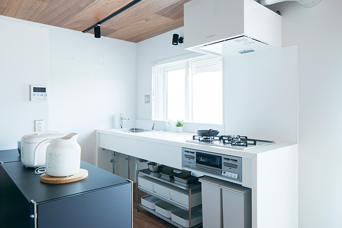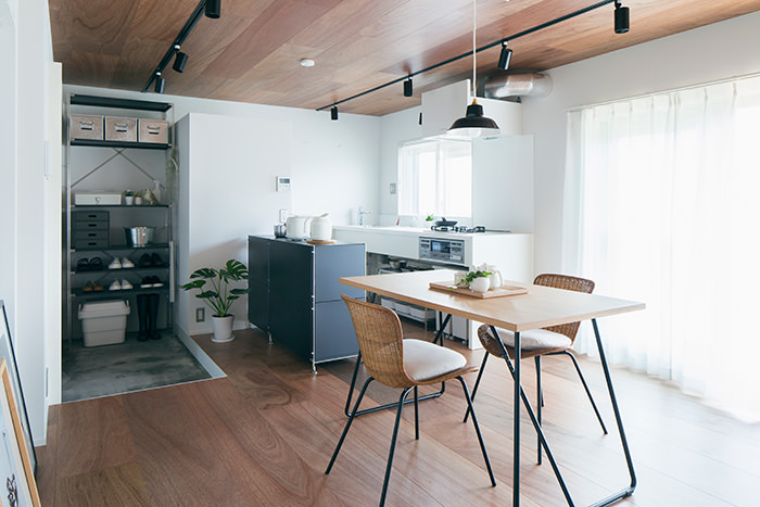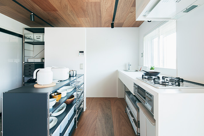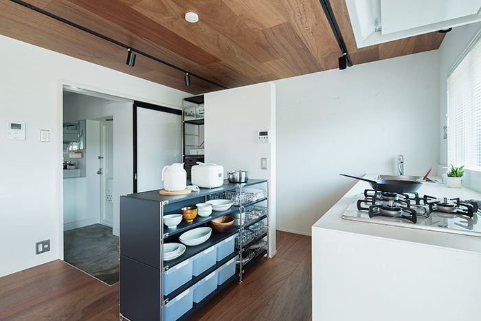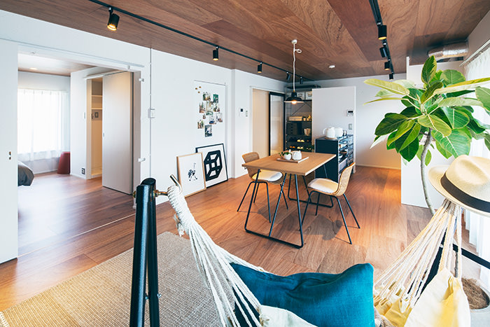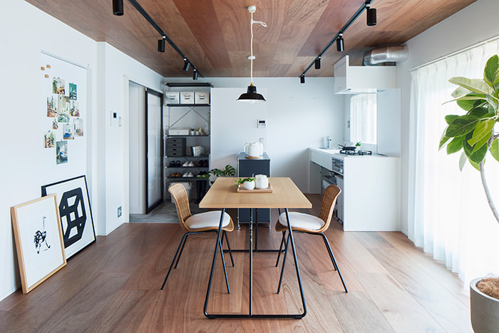 こちらの住戸でまず目を引くのは、床と天井一面にフローリングを使用しているところです。この濃い木色のフローリングがバルコニーのウッドデッキと融合して、奥内と屋外をゆるやかに繋ぎます。そしてキッチンは窓向きになっており、外の景色を楽しみながら料理が行えます。