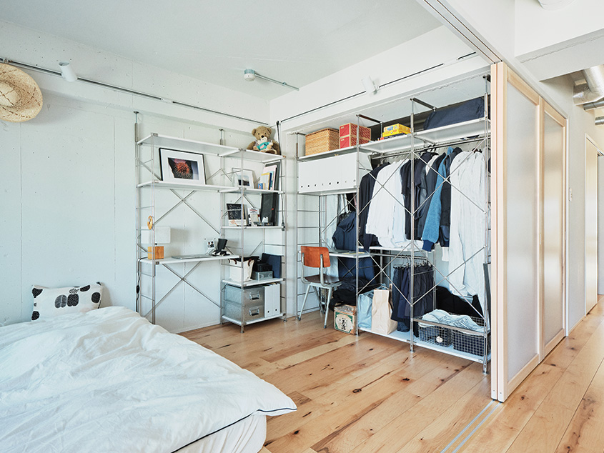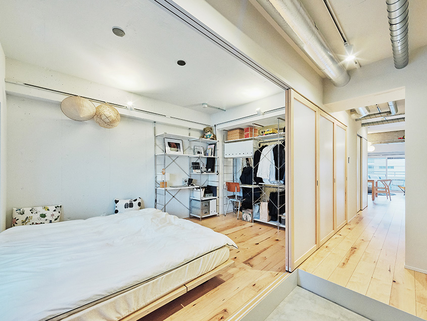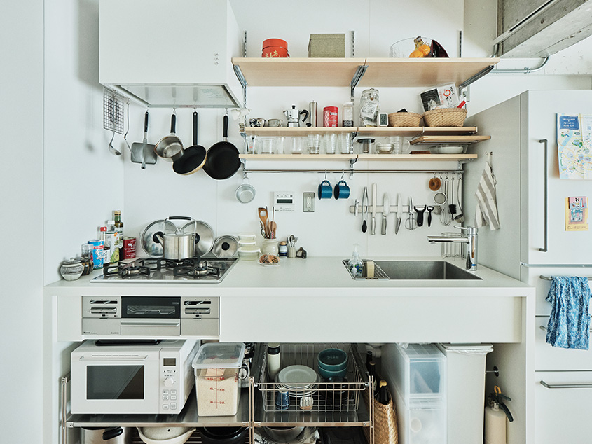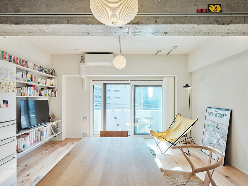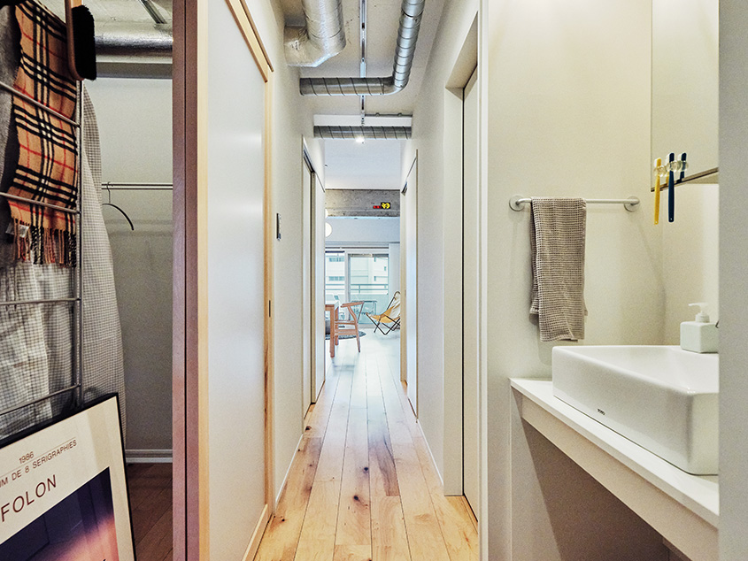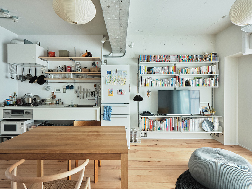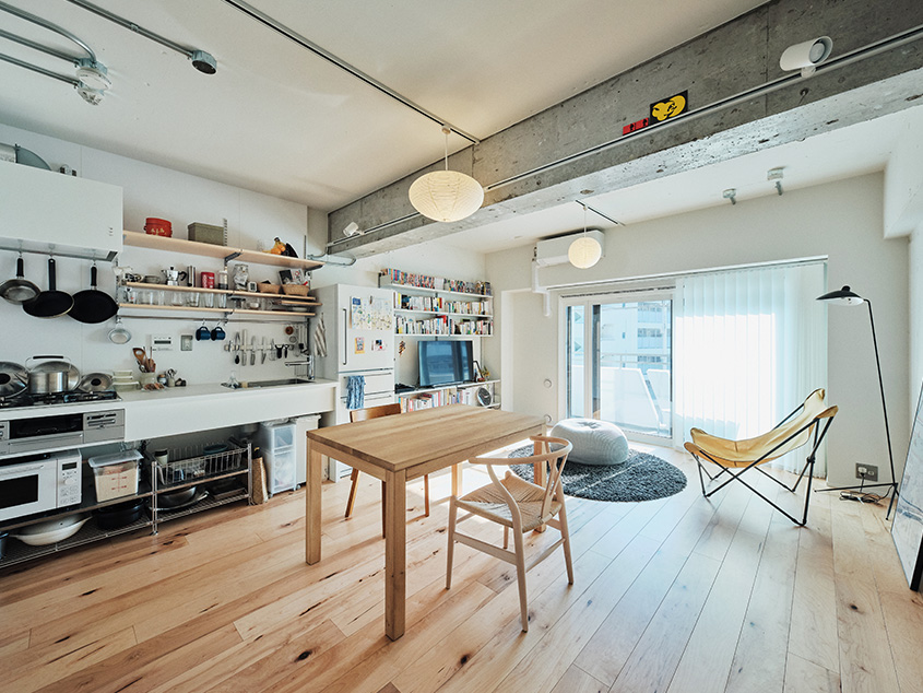 限られた空間の中でもリビングを広くして、心地よい大空間を確保することを優先事項にし、もともとあった仕切りを取り、キッチンを壁付けのスタイルにして空間を広く使うようにしました。その他のスペースも工夫を凝らしています。