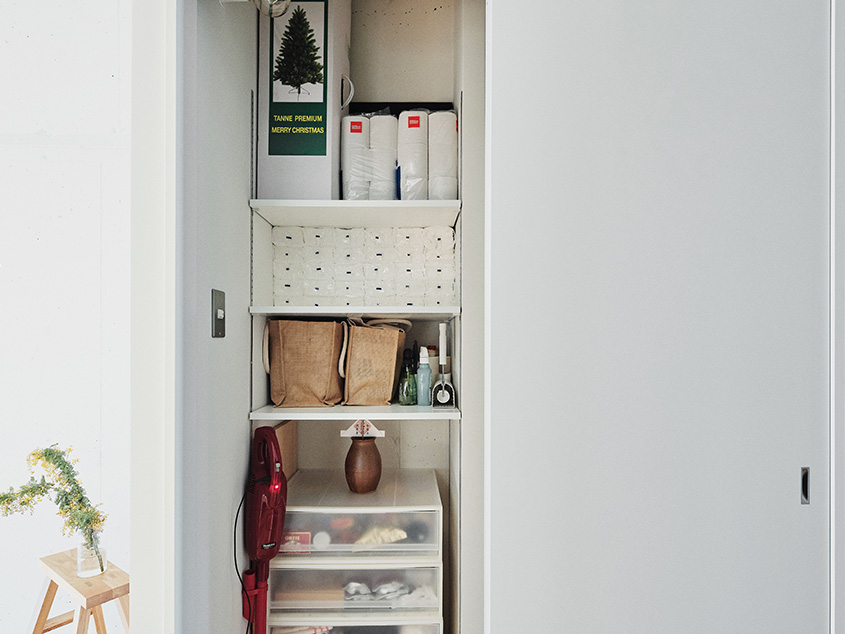 「担当の方に提案していただいて、パントリーを設けました。必要かどうか、広さはこれでいいのか、不安も幾分かあったのですが、実際に住み出すと、適度な広さの収納専用の空間があることで、居住スペースが綺麗に保たれていることに気づかされました」(オーナー)。