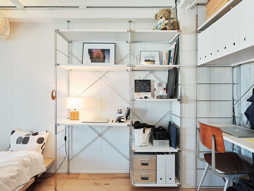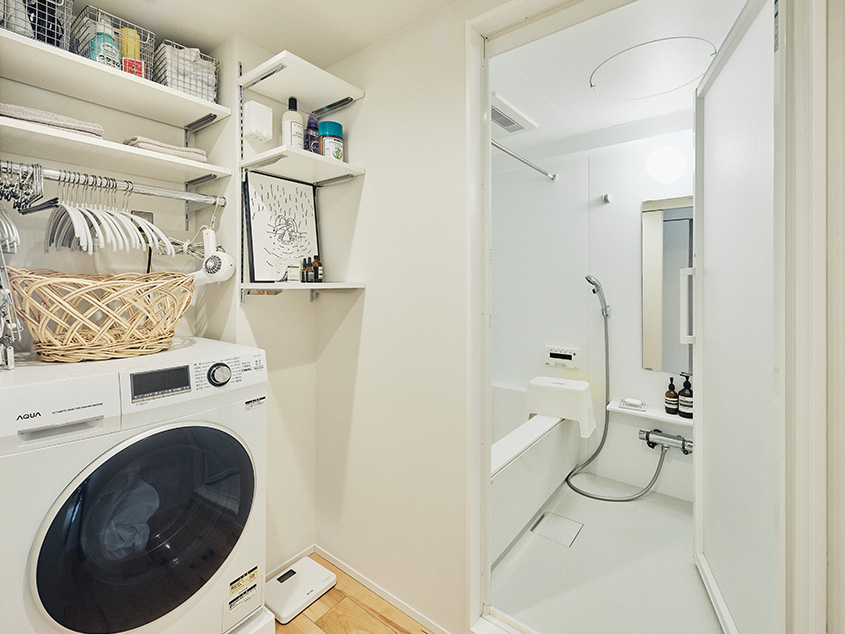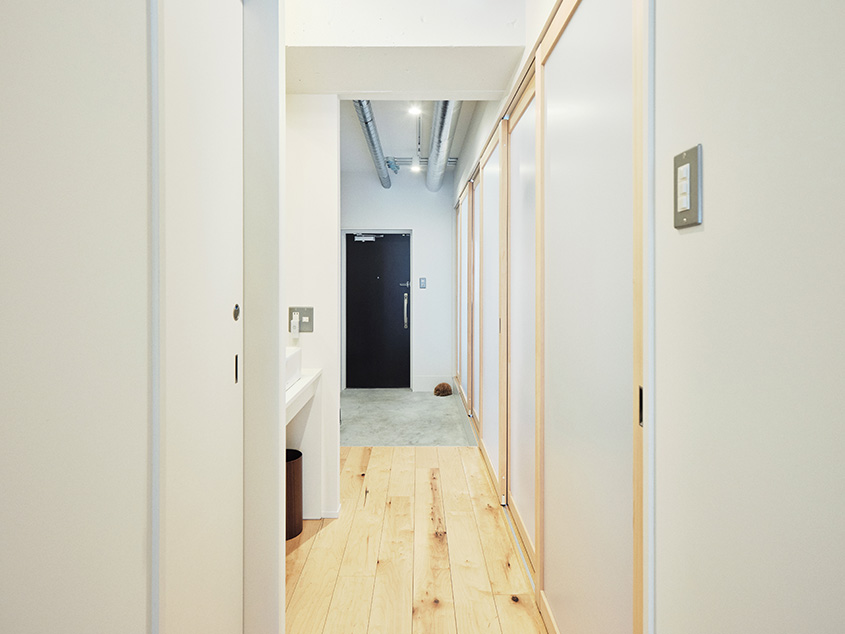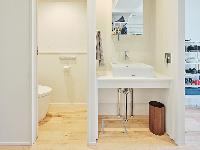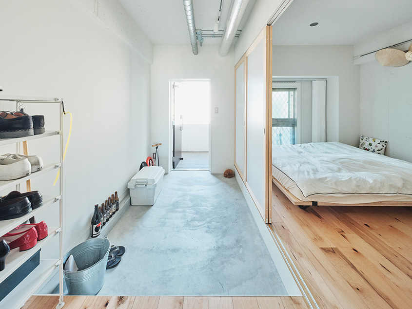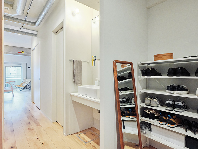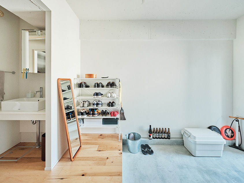 玄関の土間も広くとって、一歩目から開放感のある空間になるように。使わないスペースがなく、空間を広く使う工夫だくさんのお部屋です。