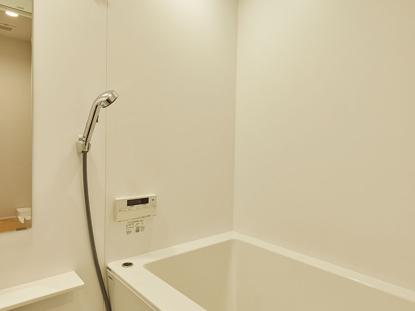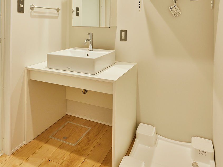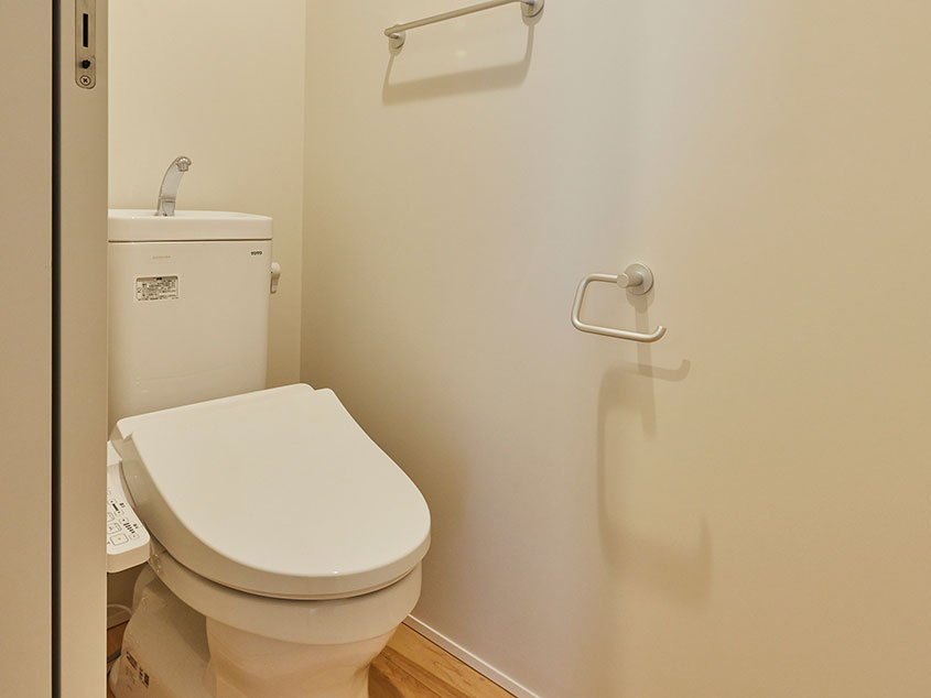 洗面室を挟んで浴室とトイレが左右に配置された、コンパクトな水回り。玄関近くにまとめてあるので、帰宅してすぐに手を洗ったり出かける前にトイレを済ませたりと導線もスムーズです。