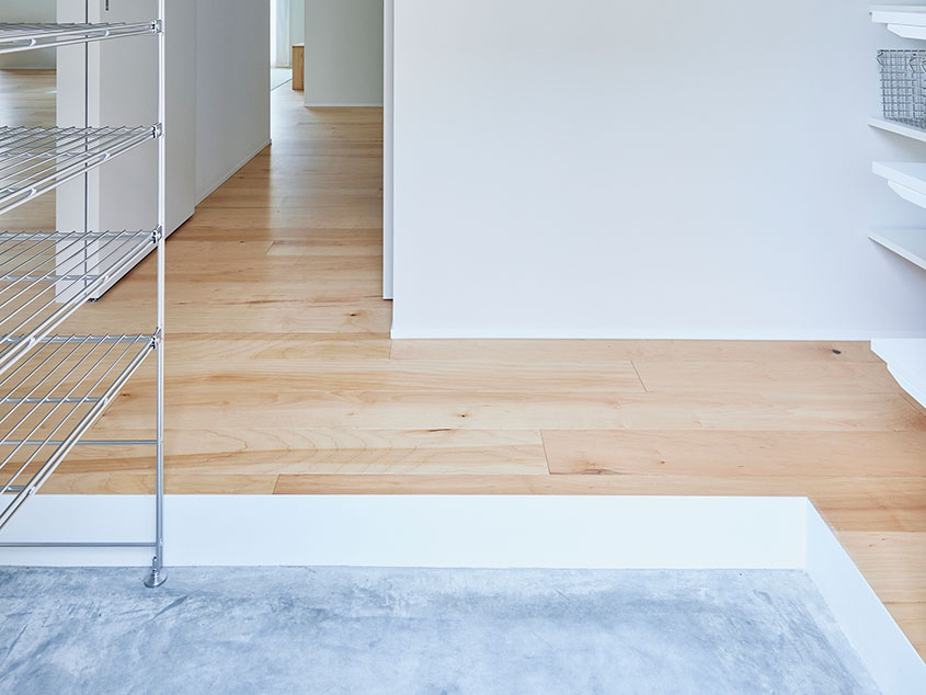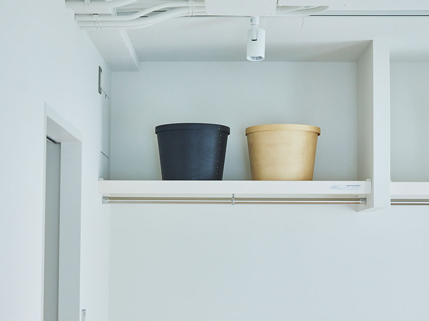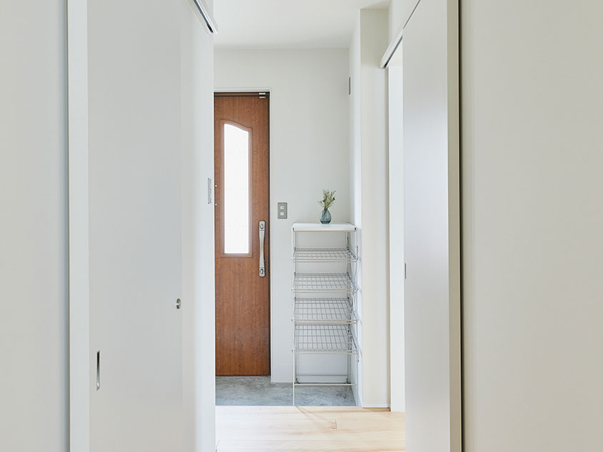 玄関の扉を開けてまず目に入るのは、玄関横に設けられた大きな収納。可動式の棚になっているので、靴を収納しておくのはもちろんのこと、アウトドアグッズやペット用品、普段は使わないキャリーケースなどを置いたり、日用品のストック場所としても重宝しそうです。