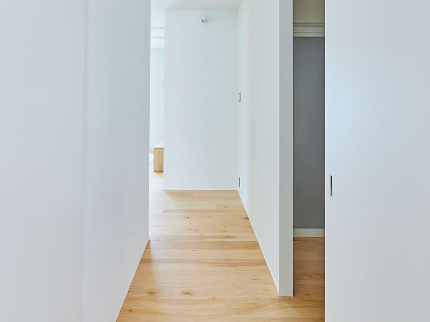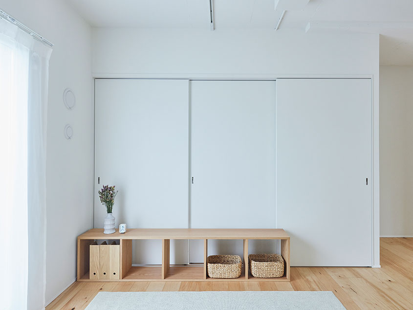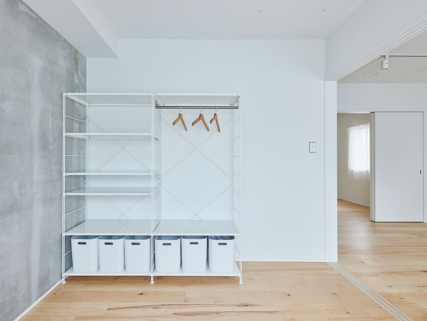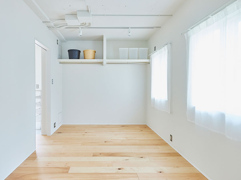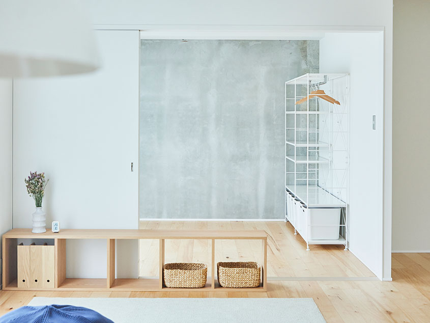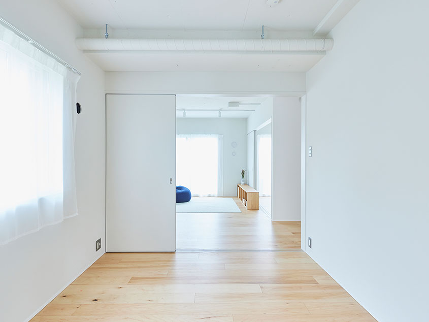 間取りは2LDKですが、2つの個室とLDKはいずれも可動引戸で間仕切りしているため、すべて開けることでひとつの空間につながります。さらに玄関側の個室は出入口を2箇所設けているので、家具などで仕切ってコンパクトな2部屋にすることも可能。壁側にオープンクロゼットも設けてあるので、ウォークインクロゼットとして使うこともできそうです。