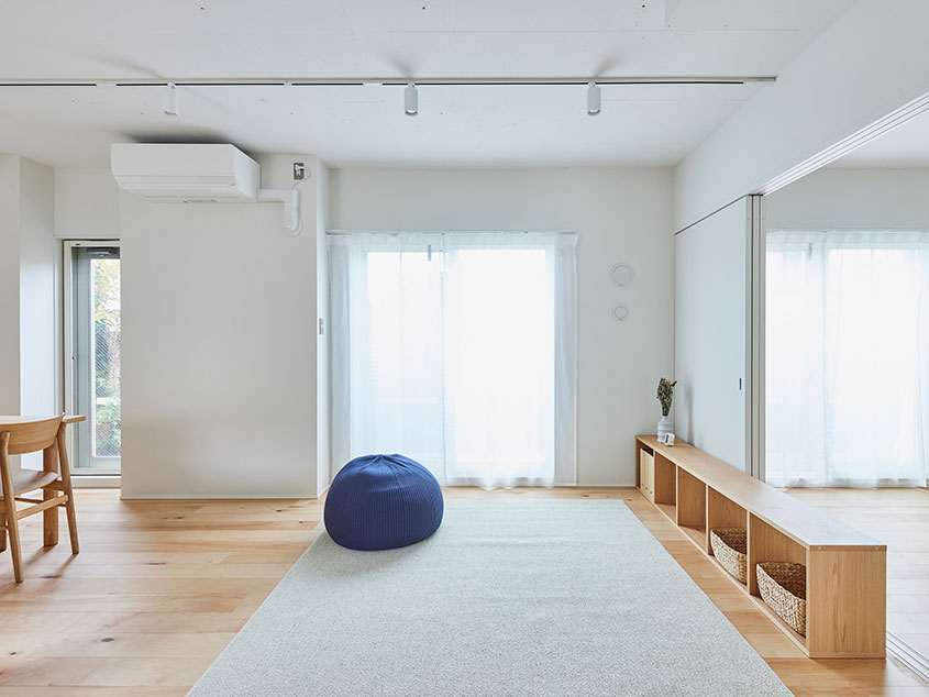 外壁面と床面には断熱材を入れ、窓にはインナーサッシを設けることで住戸の温熱環境を改善することで、床下からの冷気を感じやすい1階の住戸の温熱環境を改善しています。窓が多く、気持ちよく抜ける風を感じられるお部屋の良さを活かしたプランになっています。