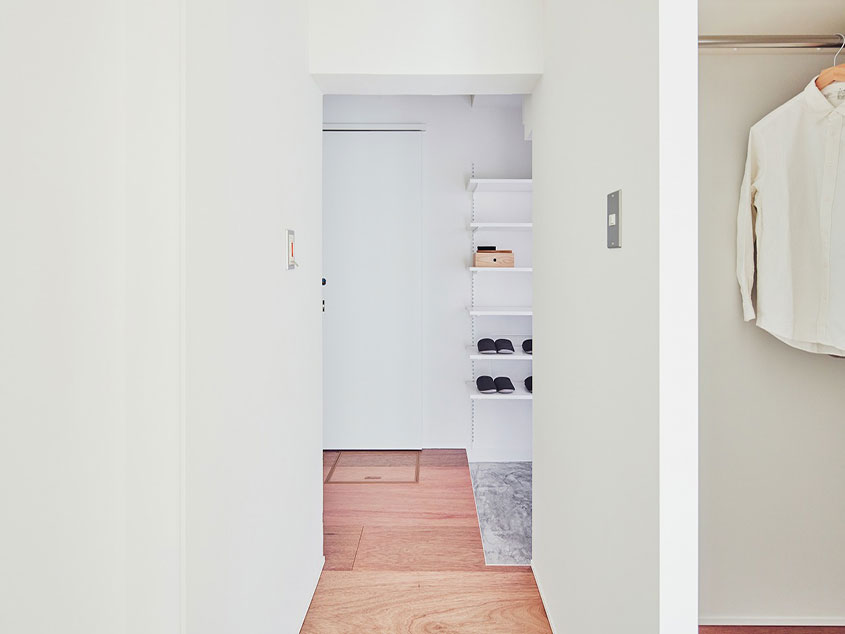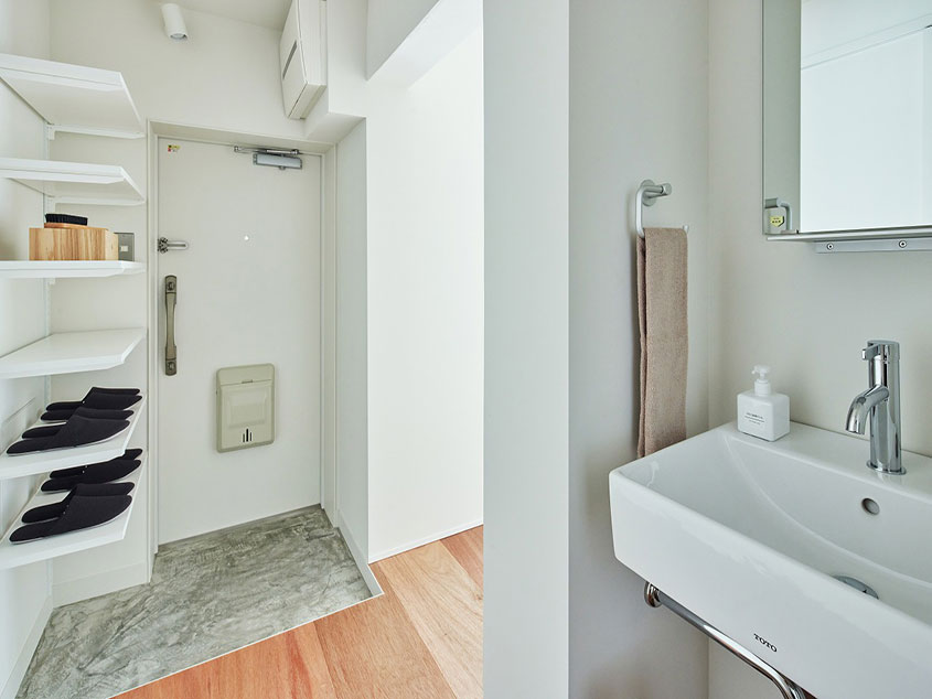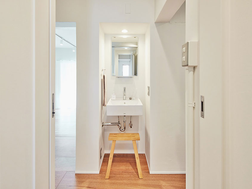 廊下にある洗面台は生活感が出やすい場所ですが、ご心配なく。壁のへこみに埋め込むような形で設置しているため、玄関からもリビングダイニングからも直接は見えません。